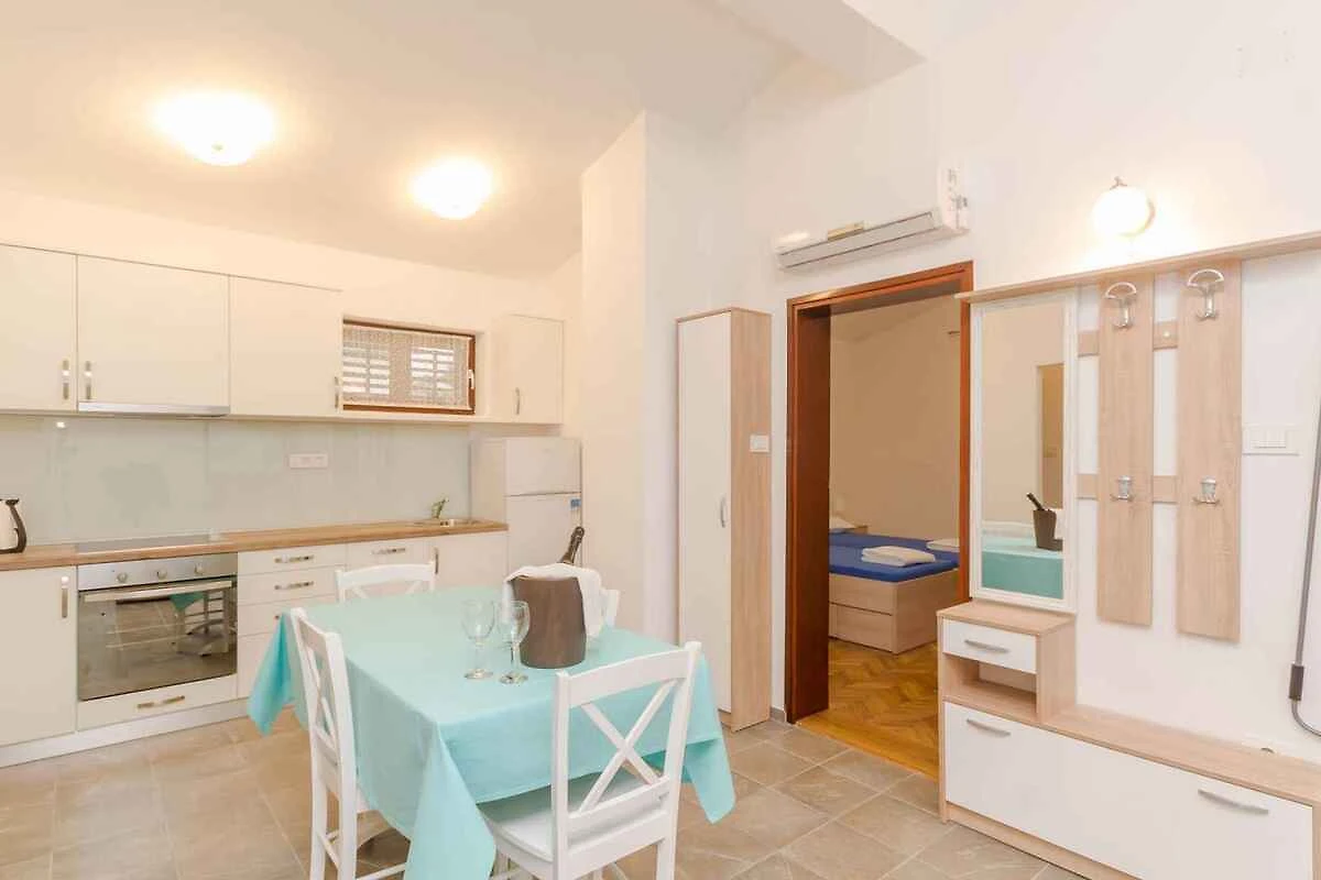 Njivice, 50 mNN. Die Ferienwohnung befindet sich auf einem geschlossenen Gartengrundstück mit Wiese, Blumen, Sträuchern und Bäumen, von einem Zaun und einer Hecke begrenzt. Der Vermieter wohnt nicht im Haus oder auf dem Grundstück. Die strandnahe kernsanierte Ferienwohnung befindet sich in einer attraktiven Lage unmittelbar am ortszentrum von der touristischen Ortschaft Njivice auf der Insel Krk, nur 50 Meter vom Meer, Supermarkt entfernt. Die Zufahrt erfolgt direkt von der Hauptstrasse (asphaltiert). Parkplatz auf dem Grundstück.