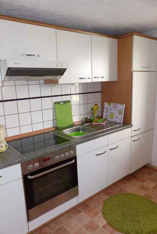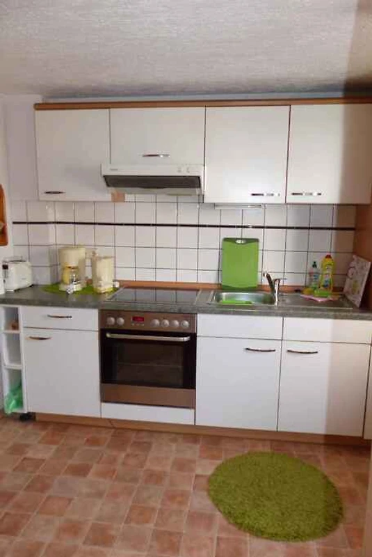 Der Eingang in Ihre Ferienwohnung befindet sich im Erdgeschoss und führt über die 20 qm grosse Terrasse direkt in das Wohnzimmer. Wohnzimmer (Durchgangszimmer) mit Sitzecke, TV, Kamin und Essecke (4 Plätze). Schlafzimmer mit 1 Doppelbett und 2 Einzelbetten. Küche (Durchgangszimmer) mit Elektroherd (Cerankochfeld, 4 Platten), Backofen, Dunstabzugshaube, Kühlschrank (Eisfach), Mikrowelle, Kaffeemaschine, Toaster und elektrischem Wasserkocher. Bad mit Dusche, 1 Waschbecken und WC.