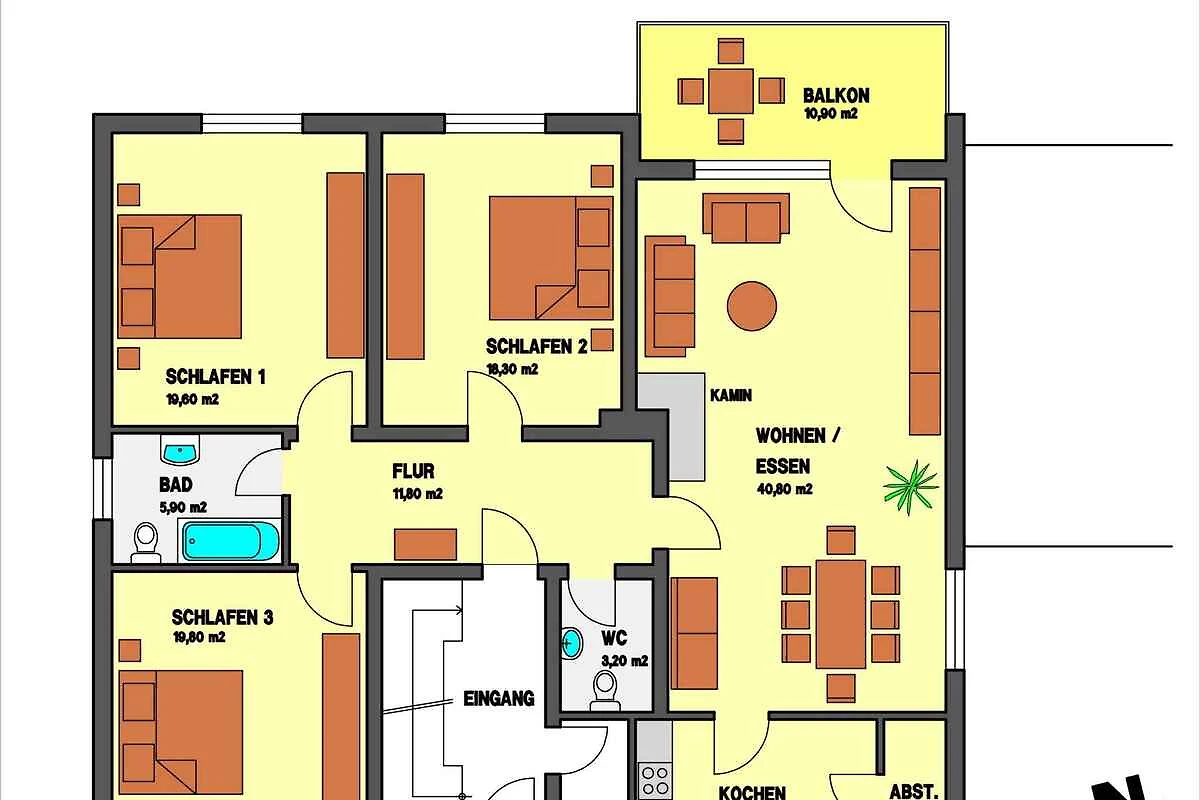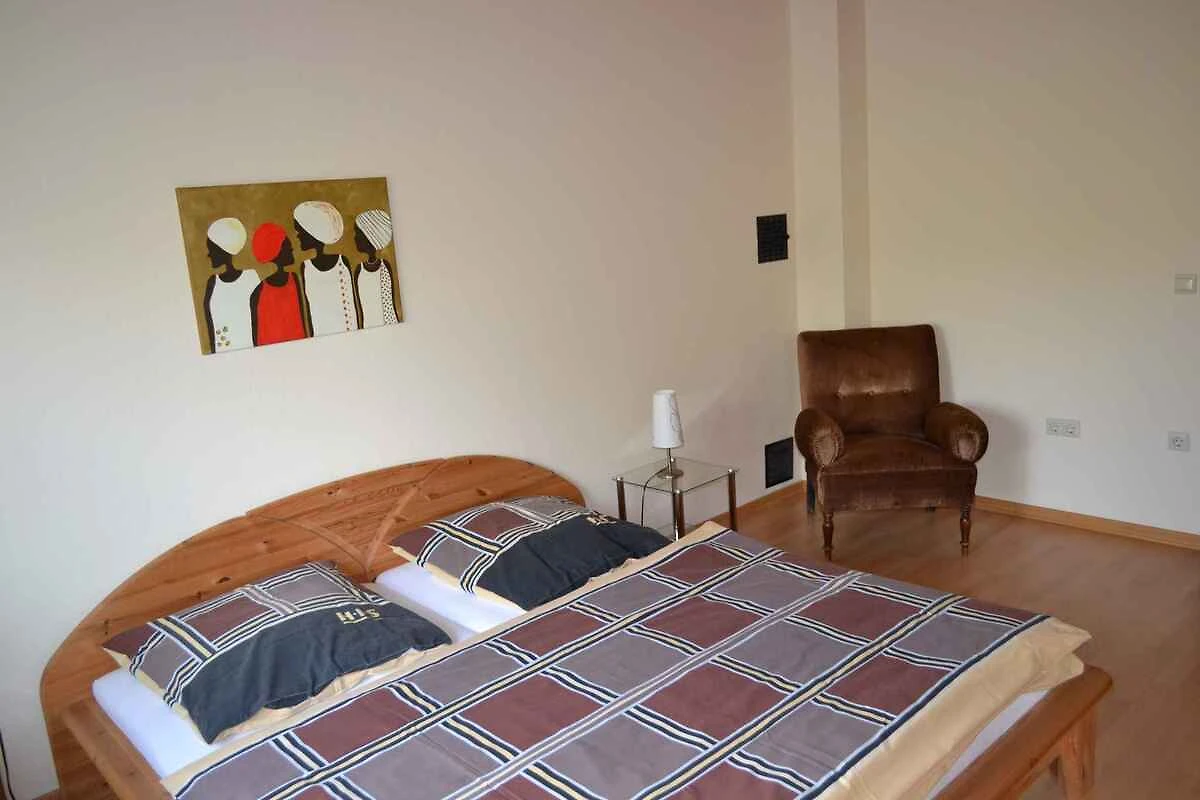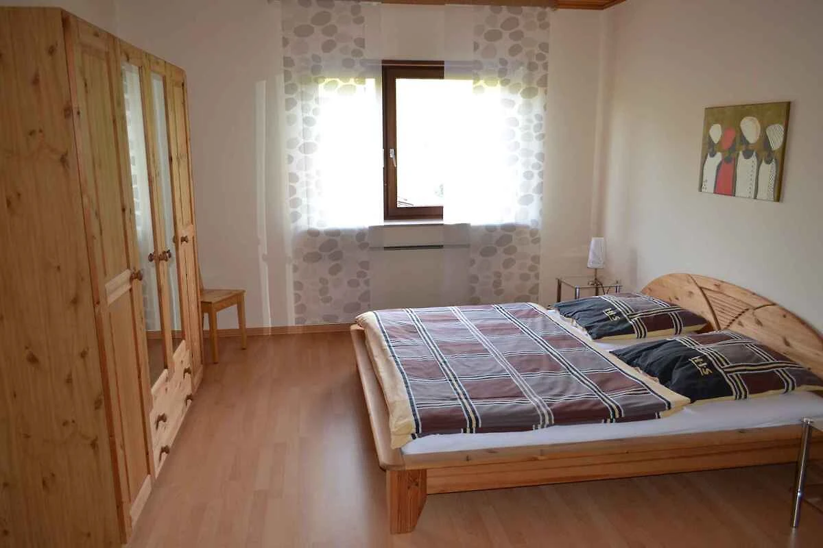 Der Eingang in Ihre Ferienwohnung befindet sich im Erdgeschoss, ist ebenerdig und führt über 2 Stufen und den 10 qm grossen Balkon direkt in den Flur mit Garderobe und Türen zu allen Räumen. Wohnzimmer (50 qm) mit Sitzecke, TV, Radio, Essecke (8 Plätze), Zugang zum Balkon (1 Tisch, 8 Stühle) und Kachelofen. 2 Schlafzimmer jeweils (18 qm) mit 1 Doppelbett. Schlafzimmer (18 qm) mit 1 Doppelbett und 1 Zusatzbett auf Couch/Sofa. Küche (8 qm) mit Elektroherd (Cerankochfeld, 4 Platten), Backofen, Dunstabzugshaube, Geschirrspüler, Kühlschrank (Eisfach), Mikrowelle, Kaffeemaschine, Toaster und elektrischem Wasserkocher. Bad mit Dusche, 1 Waschbecken, WC, Föhn und Fenster. Separates WC mit 1 Waschbecken und WC.