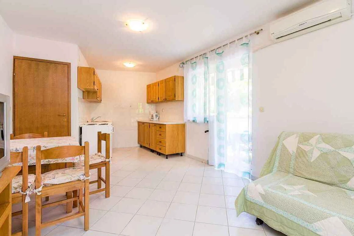 Der Eingang in Ihre Ferienwohnung befindet sich im Erdgeschoss und führt direkt in das Wohnzimmer. Wohnzimmer mit 1 Zusatzbett auf Couch/Sofa, Sitzecke, TV, Klimaanlage, Essecke und Zugang zur Terrasse (Gartenmöbel). Schlafzimmer mit 1 Doppelbett. Kochecke im Wohnzimmer mit Elektroherd (4 Platten), Backofen, Kühlschrank (Eisfach), Kaffeemaschine, elektrischem Wasserkocher und Zugang zur Terrasse (8 qm, Gartenmöbel). Bad mit Dusche, 1 Waschbecken und WC.