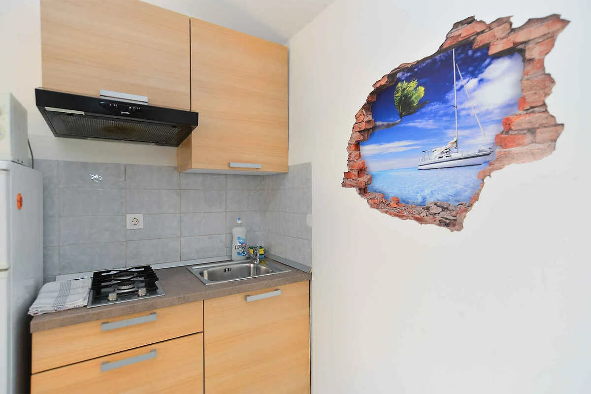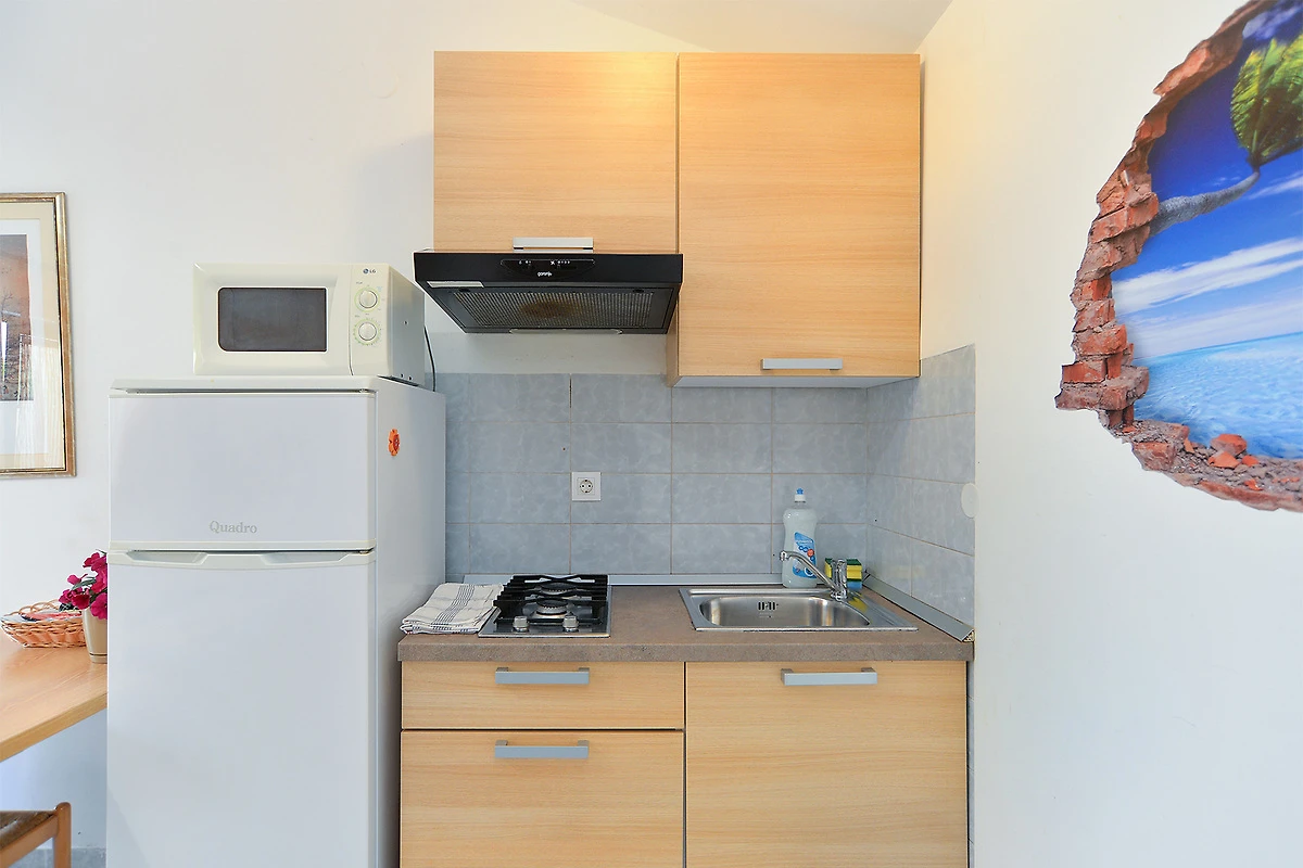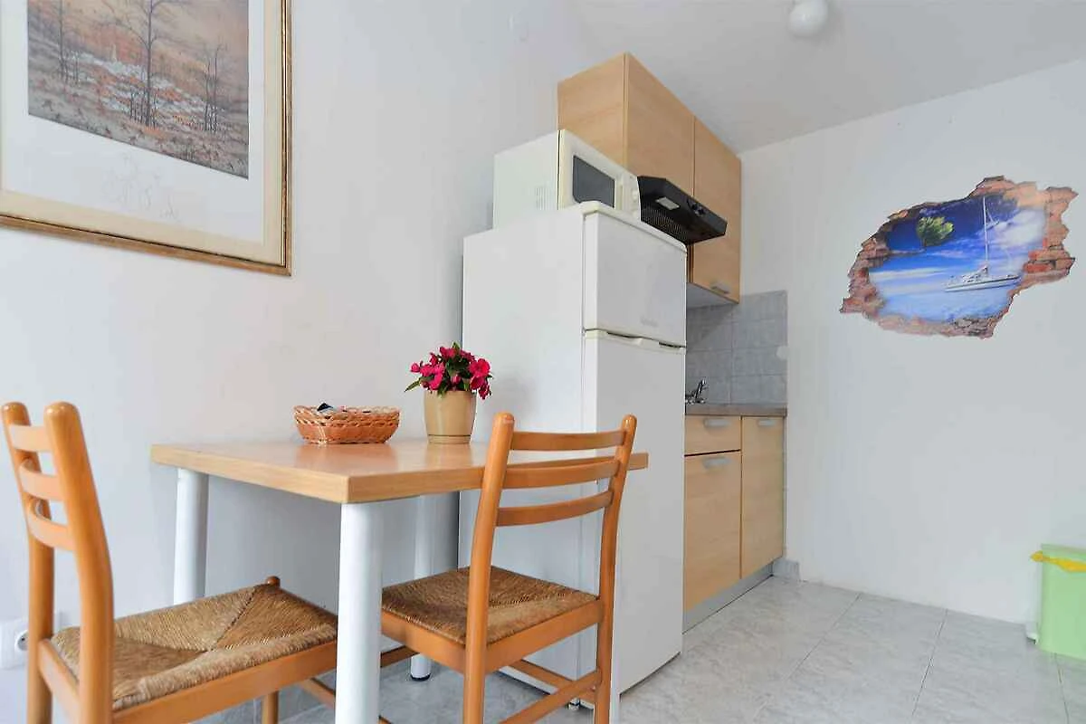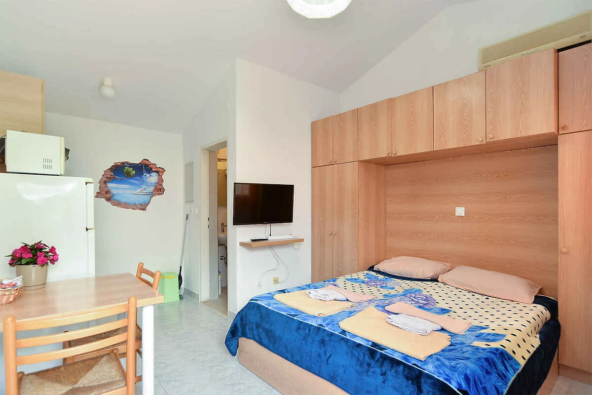 Pula. Die Ferienwohnung befindet sich auf einem Gartengrundstück. Der Vermieter wohnt ständig im Haus, nutzt jedoch einen separaten Eingang. Parkplatz (für 1 Pkw) auf dem Grundstück.