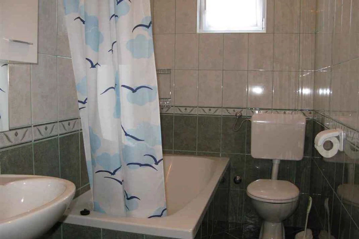 . Schlafzimmer (15 qm) mit 1 Doppelbett, 1 Einzelbett und Zugang zur Terrasse (20 qm, überdacht, Gartenmöbel). Schlafzimmer (11 qm) mit 1 Doppelbett. Küche (10 qm) mit TV, Essecke, Elektroherd (Cerankochfeld, 2 Platten), Dunstabzugshaube und Kühlschrank (Eisfach). Bad mit Dusche, 1 Waschbecken, WC und Fenster. Bad (4 qm) mit Badewanne mit Duscheinrichtung, 1 Waschbecken, WC und Fenster.