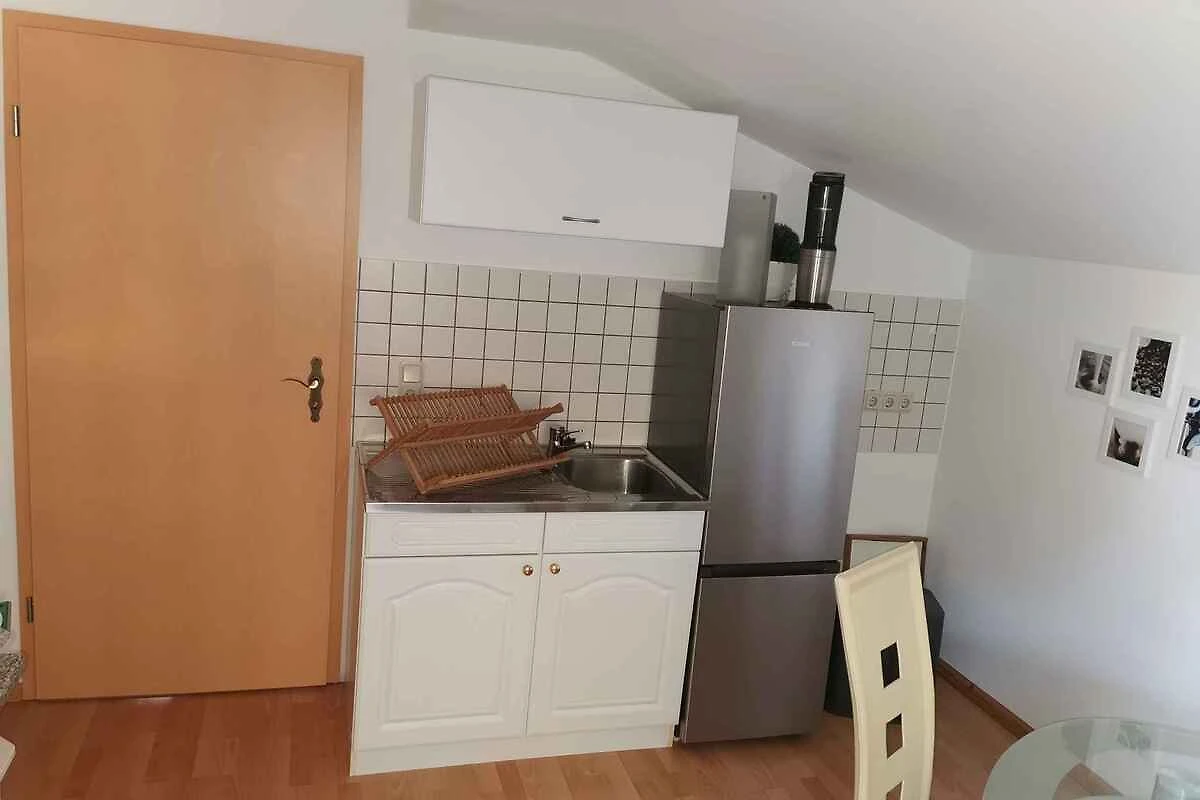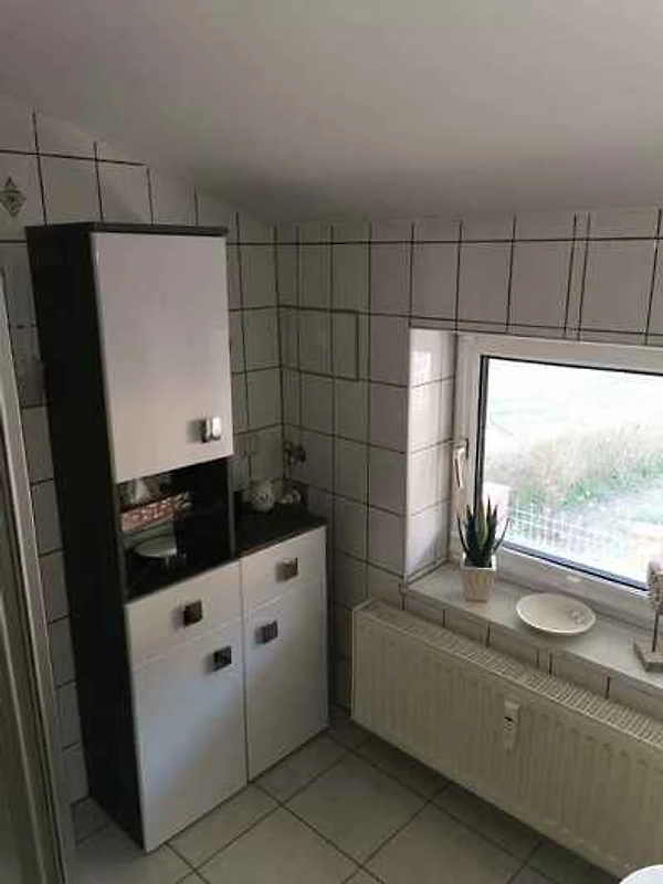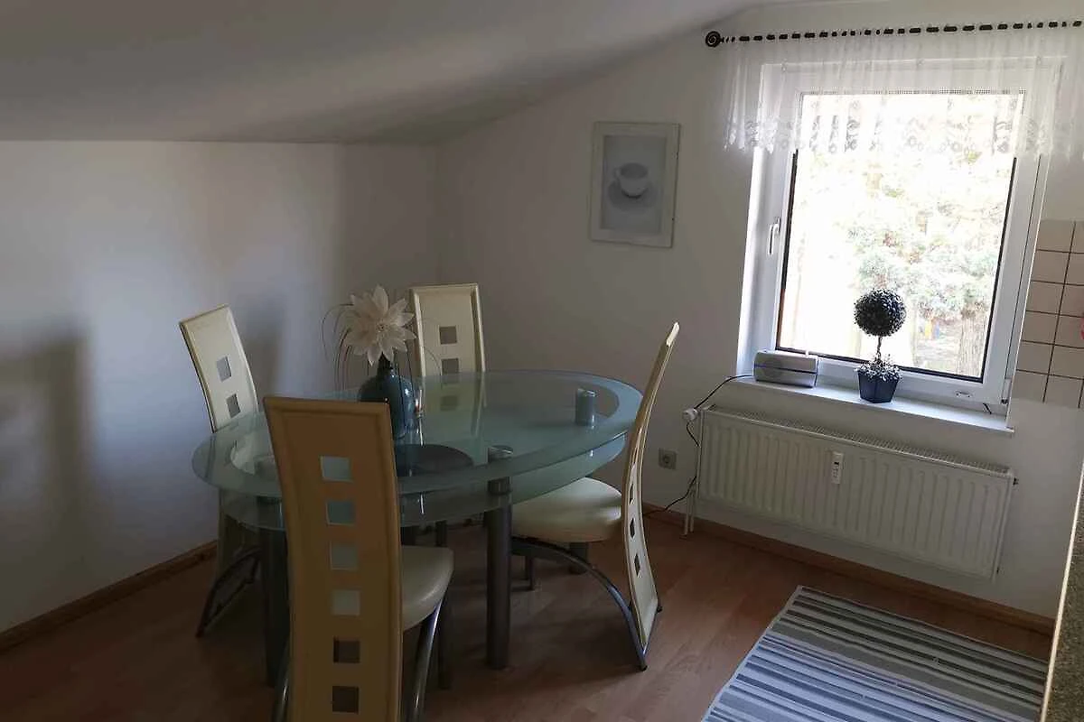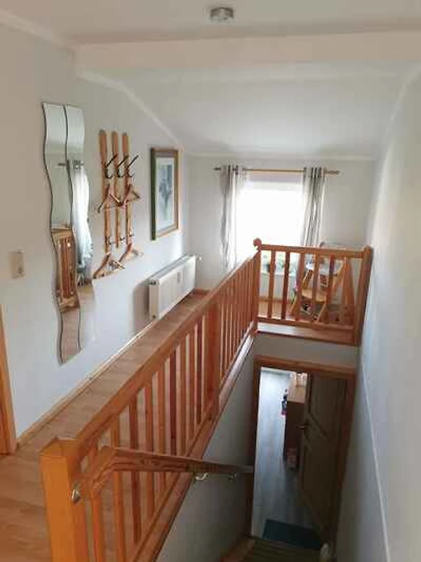 Der Eingang in Ihre Ferienwohnung befindet sich im Obergeschoss und führt über eine Innentreppe direkt in den Flur mit Garderobe und Türen zu allen Räumen. Wohn/Schlafzimmer mit 1 Einzelbett, Sitzecke, TV und Radio. Schlafzimmer mit 2 Einzelbetten. Küche mit Essecke (4 Plätze), Elektroherd (Cerankochfeld, 2 Platten), Kühlschrank (Eisfach), Kaffeemaschine, Toaster und elektrischem Wasserkocher. Bad mit Dusche, 1 Waschbecken, WC, Föhn und Fenster.