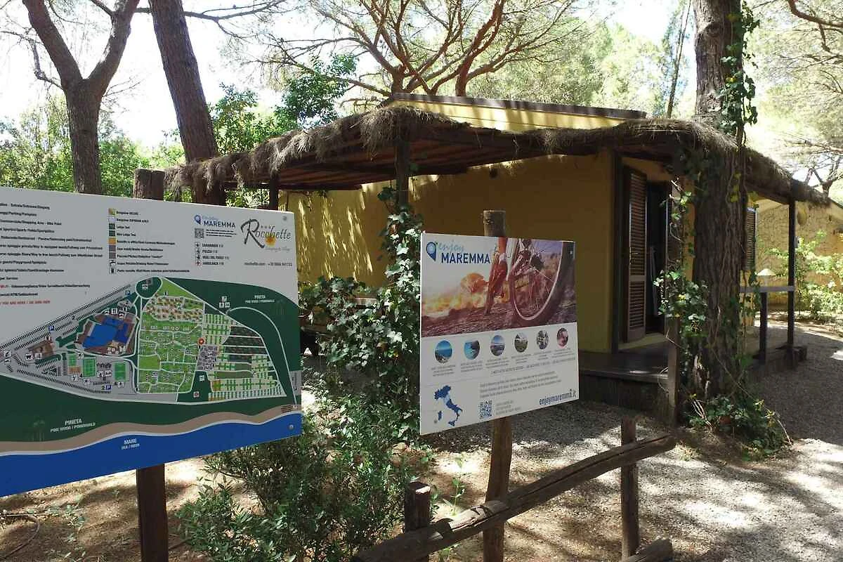 Castiglione della Pescaia. Der Bungalow befindet sich auf einem geschlossenen Wassergrundstück mit Bäumen. Der Vermieter wohnt nicht im Haus oder auf dem Grundstück. Die Zufahrt erfolgt über eine Nebenstrasse (asphaltiert). Parkplatz auf dem Grundstück.