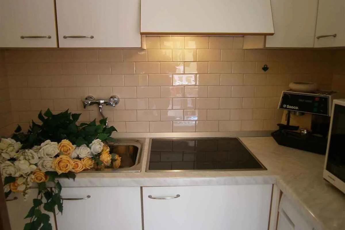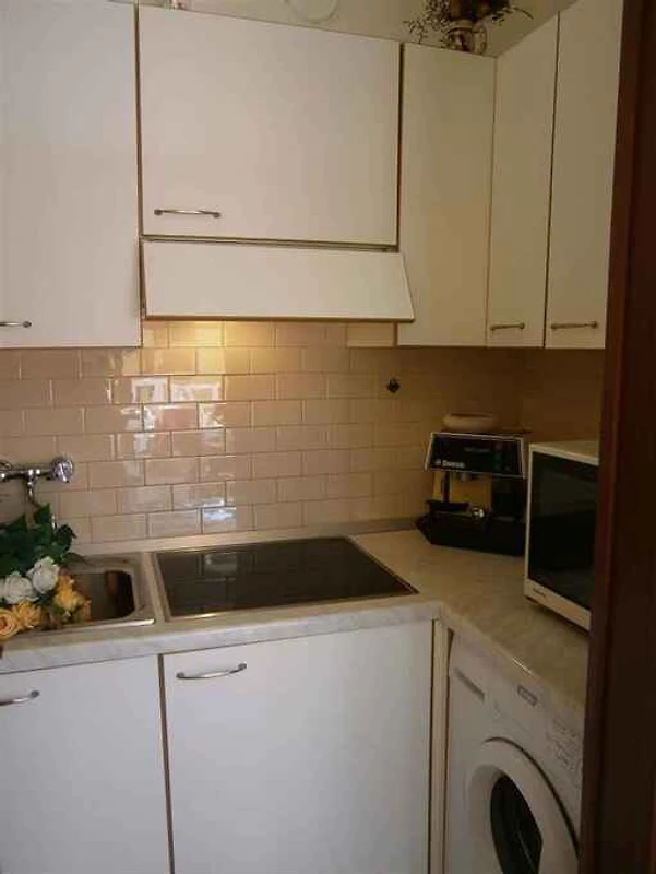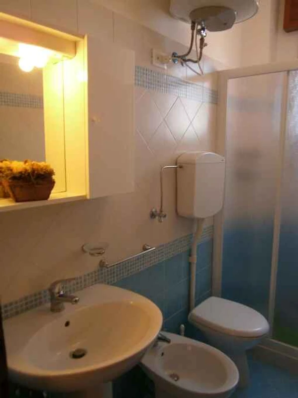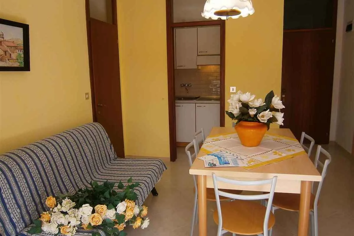 und ist ebenerdig. Wohn/Schlafzimmer mit 2 Zusatzbetten auf Couch/Sofa, Sitzecke, TV, Essecke (5 Plätze) und Zugang zum Balkon. Schlafzimmer mit 2 Einzelbetten, 1 Gitterbett und Babybett auf Wunsch gegen Gebühr. Schlafzimmer mit 1 Doppelbett und Zugang zum Balkon (Gartenmöbel). Kochnische in der Wohnküche mit Elektroherd (2 Platten), Kühlschrank (Eisfach), Mikrowelle, Kaffeemaschine und elektrischem Wasserkocher. Bad mit Dusche, WC und Bidet.