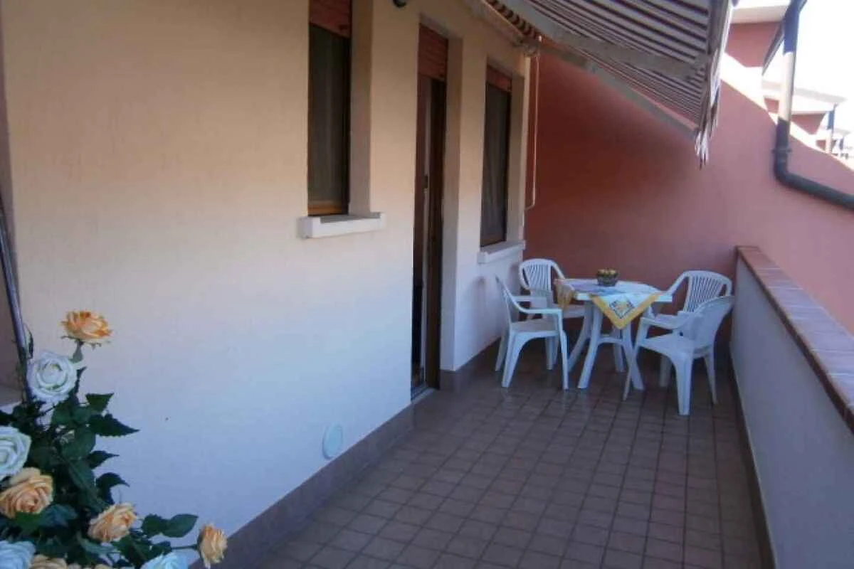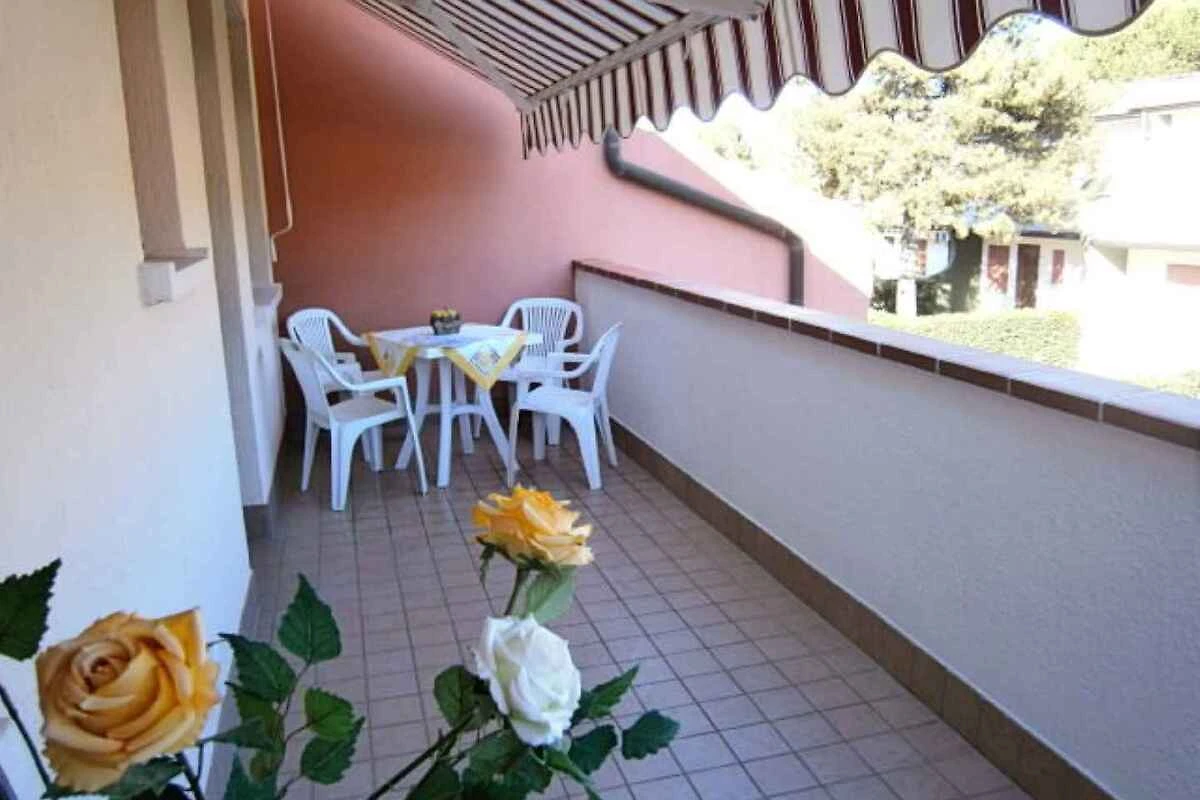 Bibione, Ortsteil Spiaggia -Therme. Die Ferienwohnung befindet sich auf einem geschlossenen Gartengrundstück mit Wiese, Blumen und Bäumen, von einem Zaun und einer Hecke begrenzt. Der Vermieter wohnt nicht im Haus oder auf dem Grundstück. Die Zufahrt erfolgt direkt von der Hauptstrasse (asphaltiert). Parkplatz (für 1 Pkw) in Carport.