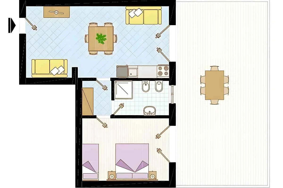 Wohn/Schlafzimmer mit 2 Zusatzbetten auf Doppelausziehcouch, TV und Zugang zum Balkon. Schlafzimmer mit 1 Doppelbett, 1 Einzelbett, 1 Gitterbett und Babybett auf Wunsch. Kochecke im Wohnzimmer mit Kühlschrank, Mikrowelle und Kaffeemaschine. Bad mit Dusche und WC.