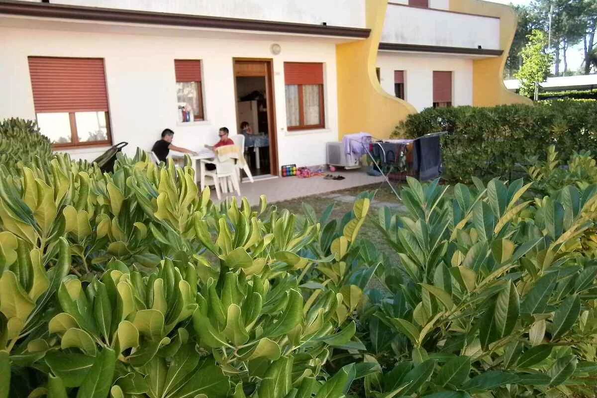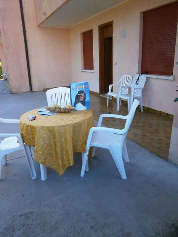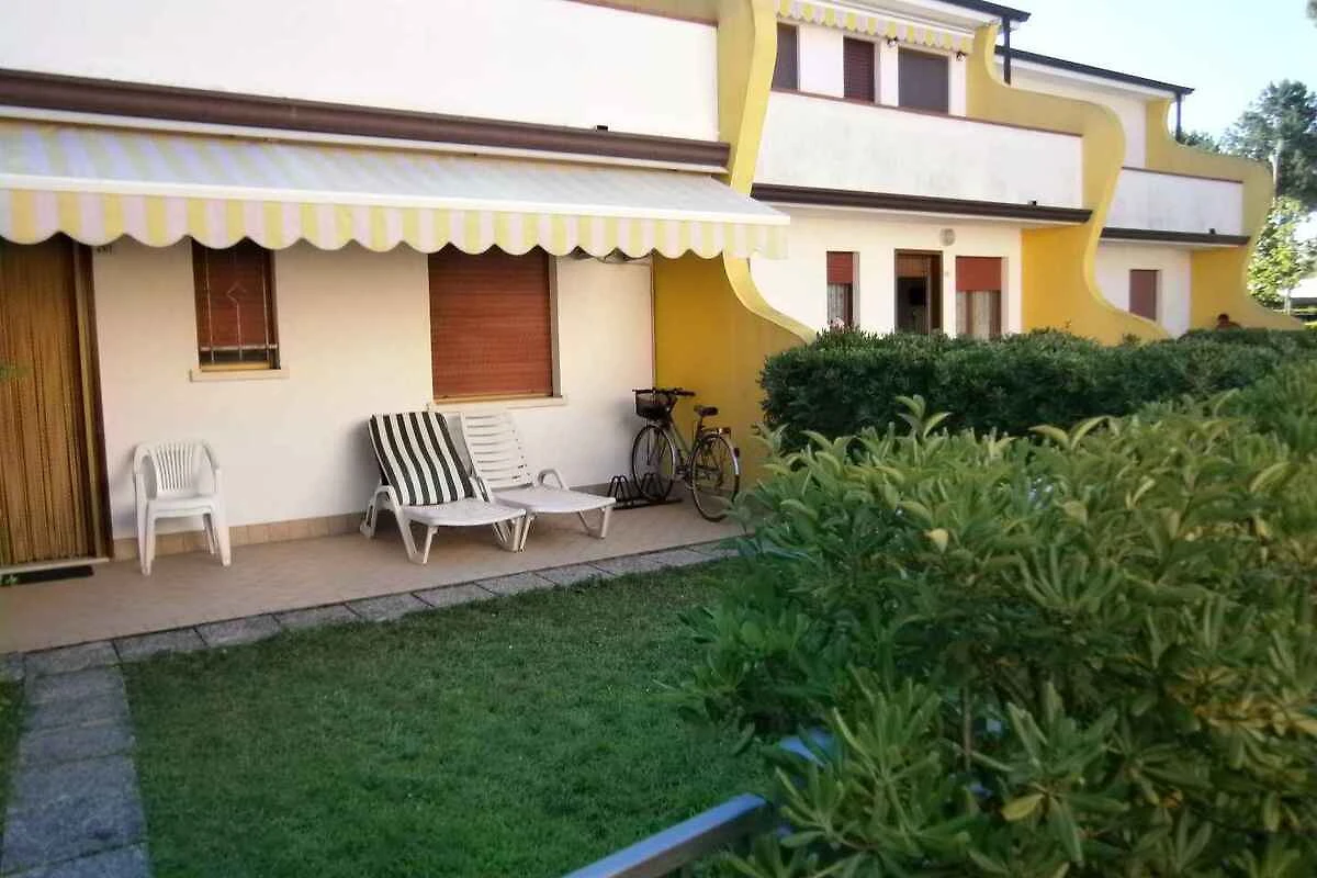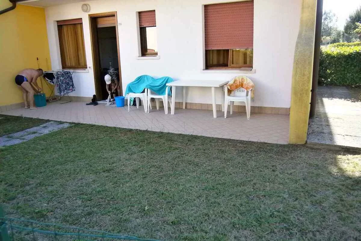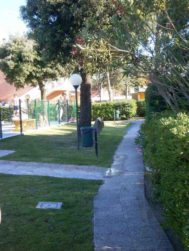 Bibione. Die Ferienwohnung befindet sich auf einem geschlossenen Gartengrundstück mit Wiese und Bäumen, von einem Zaun und einer Hecke begrenzt. Der Vermieter wohnt nicht im Haus oder auf dem Grundstück. Die Zufahrt erfolgt direkt von der Hauptstrasse (asphaltiert). Parkplatz (für 1 Pkw) auf dem Grundstück.