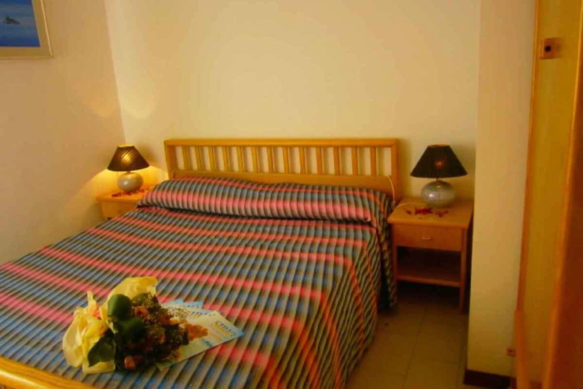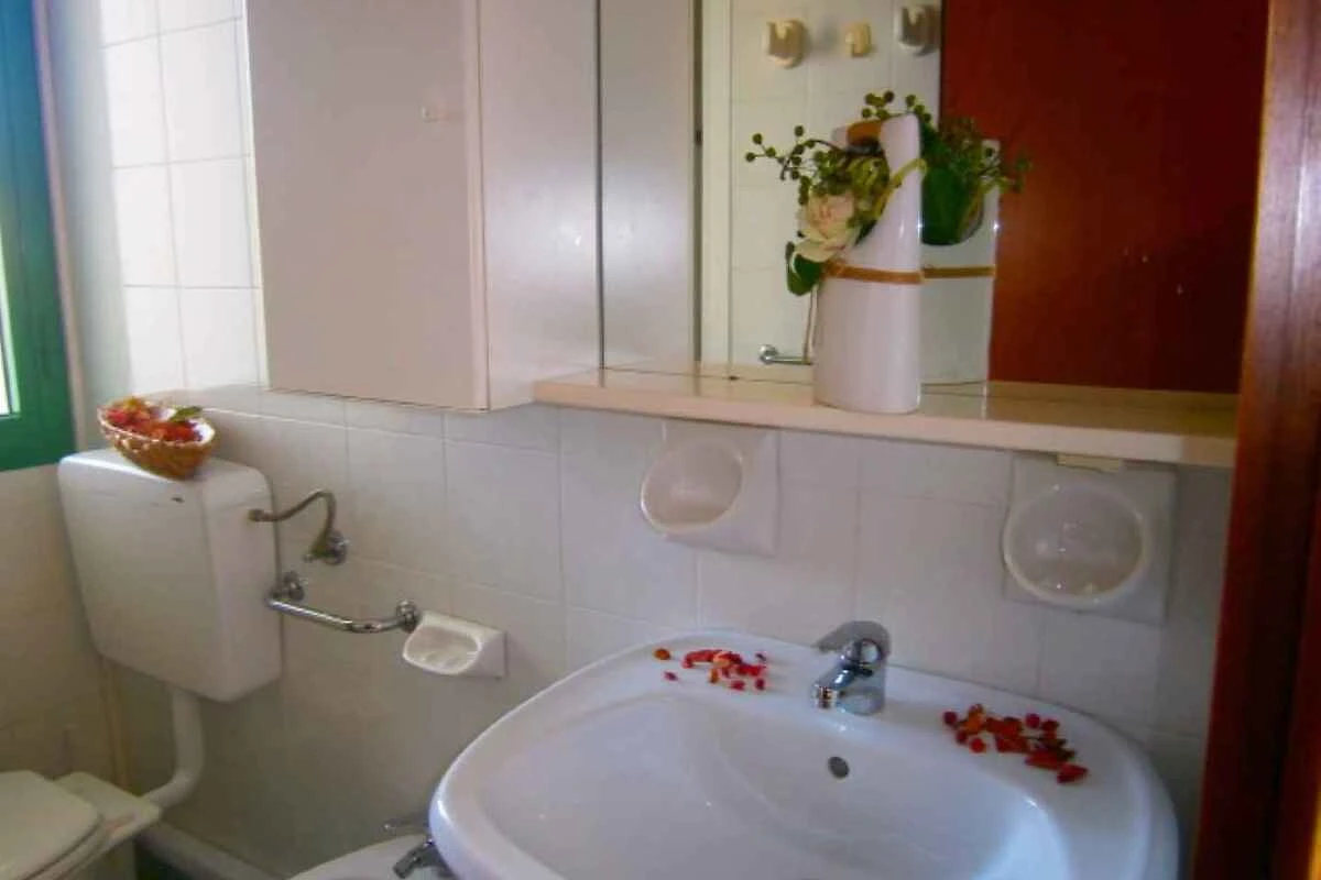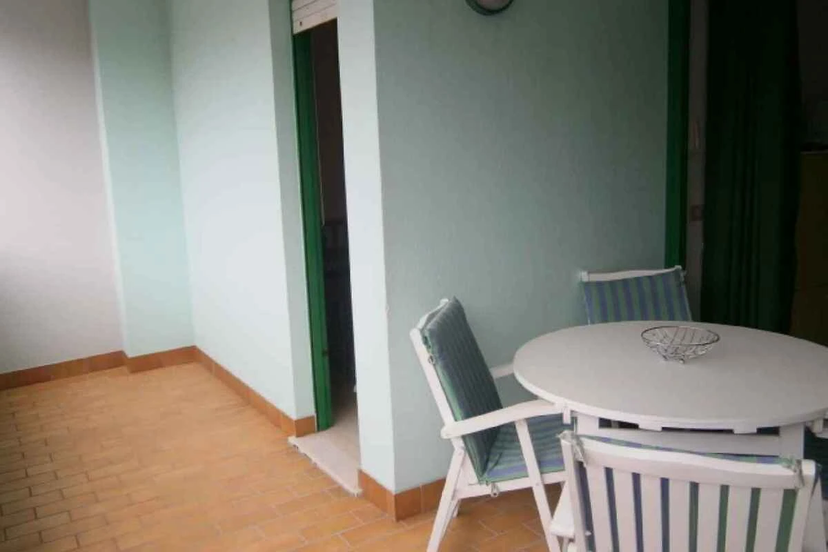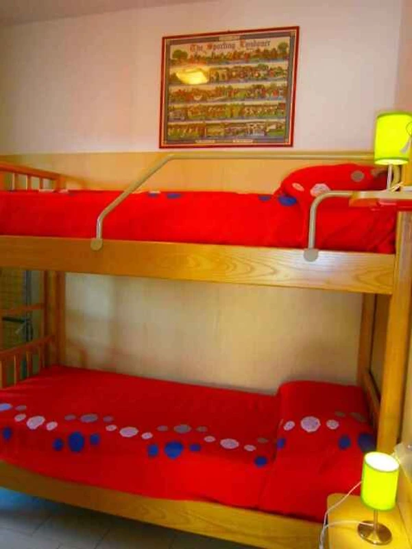Der Eingang in Ihre Ferienwohnung befindet sich in der 2. Etage und führt direkt in die Küche. Wohn/Schlafzimmer mit 2 Zusatzbetten auf Doppelausziehcouch, Sitzecke, TV und Zugang zum Balkon (Gartenmöbel, 1 Tisch, 6 Stühle). Schlafzimmer mit 1 Etagenbett und Zugang zum Balkon. Schlafzimmer mit 1 Doppelbett, 1 Gitterbett und Zugang zum Balkon. Kochnische im Wohn/Schlafzimmer mit Essecke (4 Plätze), Gasherd (4 Flammen), Kühlschrank (Eisfach), Mikrowelle und Kaffeemaschine. Bad mit Dusche, 1 Waschbecken, WC und Bidet.