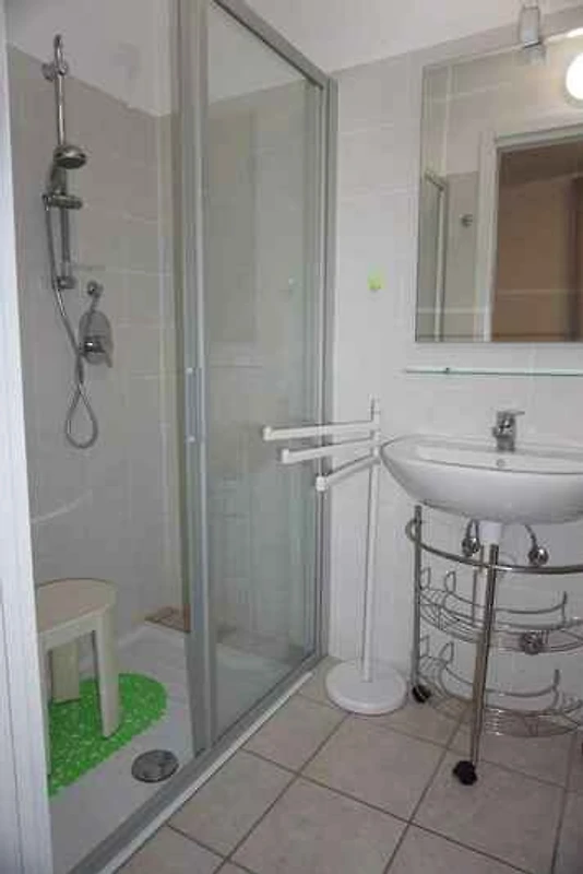 Erdgeschoss: Wohn/Schlafzimmer mit 2 Zusatzbetten auf Couch/Sofa, TV, Essecke und Zugang zur Terrasse. Kochnische im Wohn/Schlafzimmer mit Gasherd, Kühlschrank (Eisfach) und Mikrowelle. Bad mit Dusche und WC.