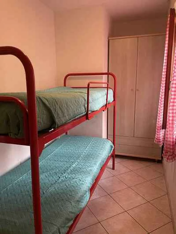 Seperater Eingang. Wohnzimmer mit 1 Zusatzbett auf Couch/Sofa, Sitzecke und TV. Schlafzimmer mit 2 Einzelbetten. Schlafzimmer mit 3 Einzelbetten. Kochecke im Wohnzimmer mit Gasherd. Bad mit Dusche, 1 Waschbecken und WC.
