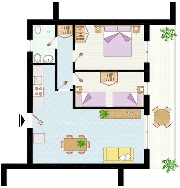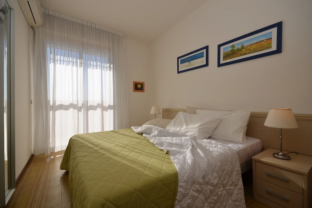 Wohn/Schlafzimmer mit 2 Zusatzbetten auf Couch/Sofa, TV und Zugang zum Balkon. Schlafzimmer mit 2 Einzelbetten. Schlafzimmer mit 1 Doppelbett. Kochnische im Wohn/Schlafzimmer mit Mikrowelle und Kaffeemaschine. Bad mit Waschmaschine, Dusche, 1 Waschbecken und WC.