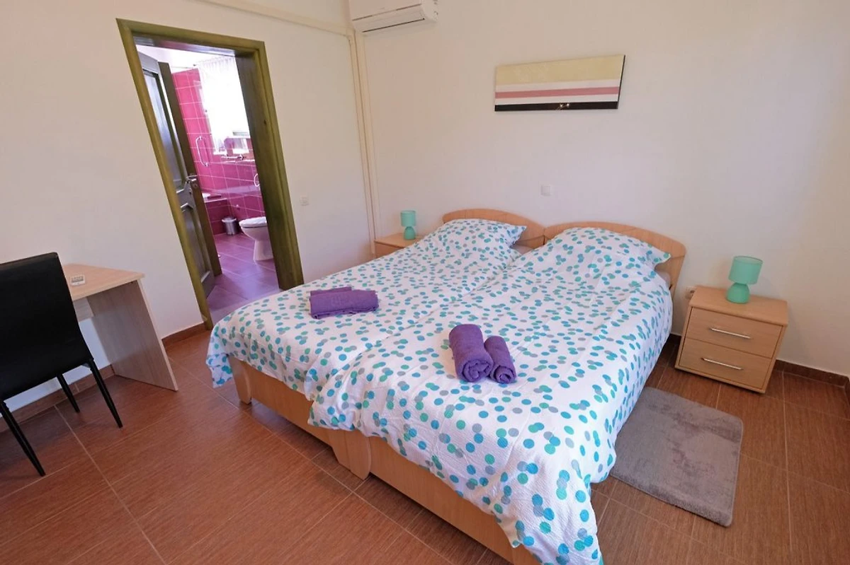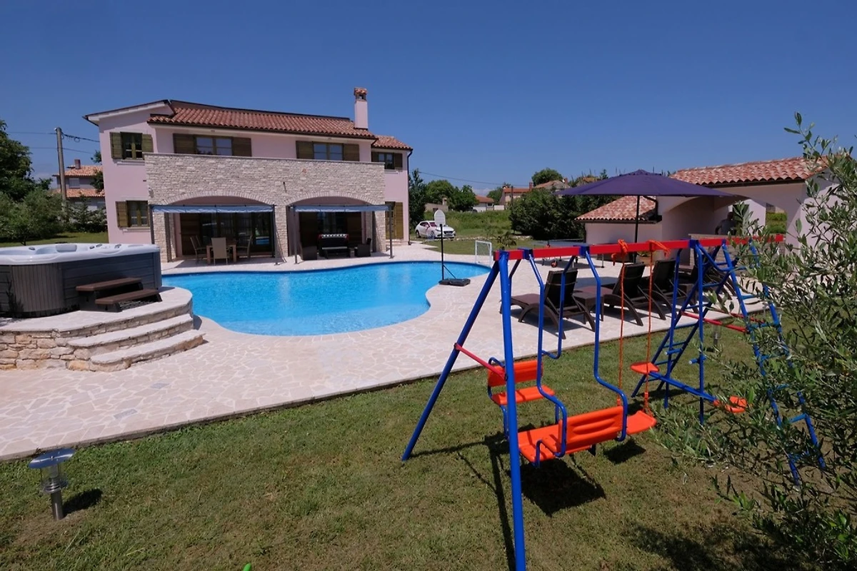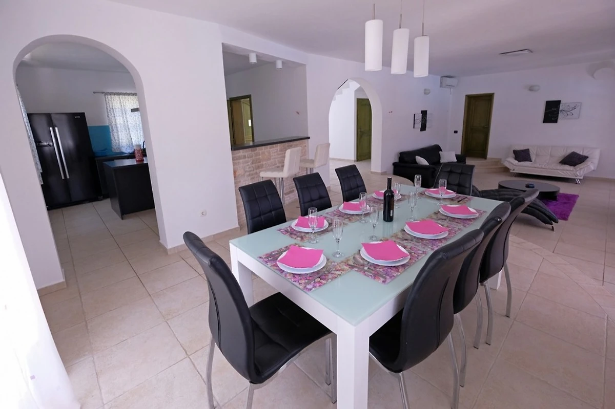 Villa Venka ist ein komfortables zweistöckiges Haus mit vier Parkplätzen und einem großen Pool auf dem Grundstück. Im Erdgeschoss befinden sich ein schönes Wohnzimmer mit Pool- und Gartenzugang, eine voll ausgestattete Küche mit Essbereich, ein Doppelzimmer mit Dusche, ein separates WC und ein Abstellraum sowie eine große Lobby. Im Erdgeschoss befinden sich vier geräumige Doppelzimmer, zwei Badezimmer mit Badewanne, von denen eines massiert ist. Zwei Schlafzimmer haben Zugang zu einem großen Balkon. Das Haus ist mit 6 Klimaanlagen ausgestattet. In einem Garten, der sich über 6ooo Quadratmeter erstreckt, befindet sich ein Grillhaus im Freien. Das Äußere ist mit hochwertigen Möbeln eingerichtet, mit sechs Liegestühlen und einem Whirlpool für 5 Personen. Zahlreiche Unterhaltungsmöglichkeiten wie Tischfußball, Tischtennis, ein Kinderspielplatz mit Trampolin, Fußballplätze, Badminton- und Volleyballnetz sowie ein Basketballkorb befinden sich auf dem Spielfeld. Sechs Fahrräder stehen den Gästen zur Verfügung.