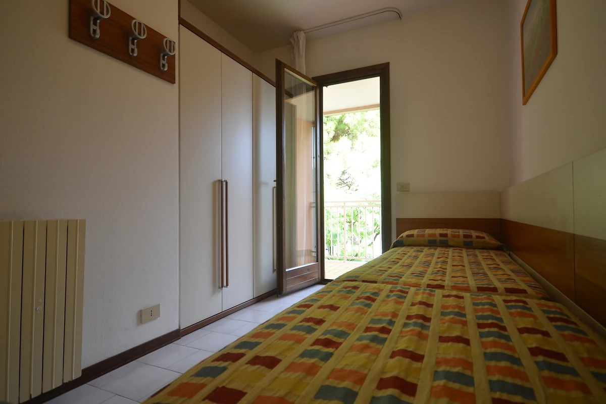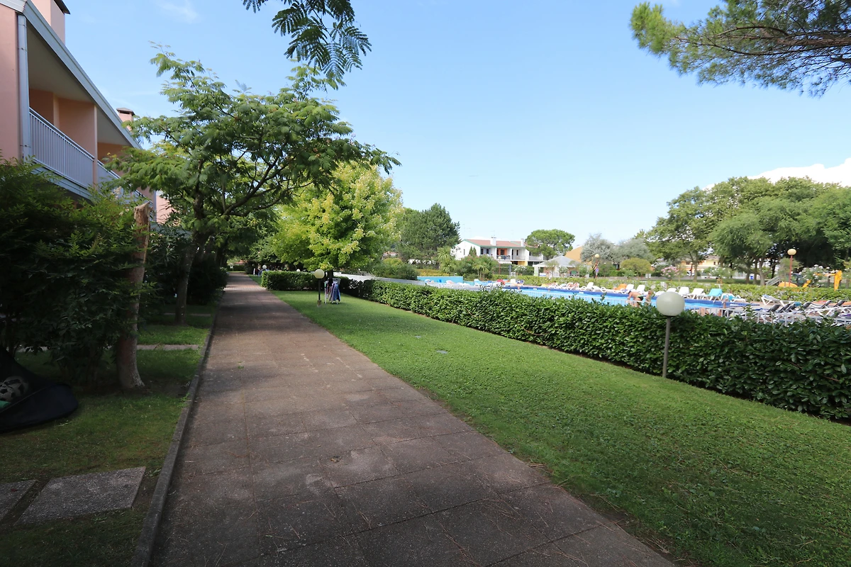 Bibione, Ortsteil Spiaggia. Die Ferienwohnung befindet sich in einer Ferienanlage, auf einem Gartengrundstück. Parkplatz (für 1 Pkw) auf dem Grundstück.