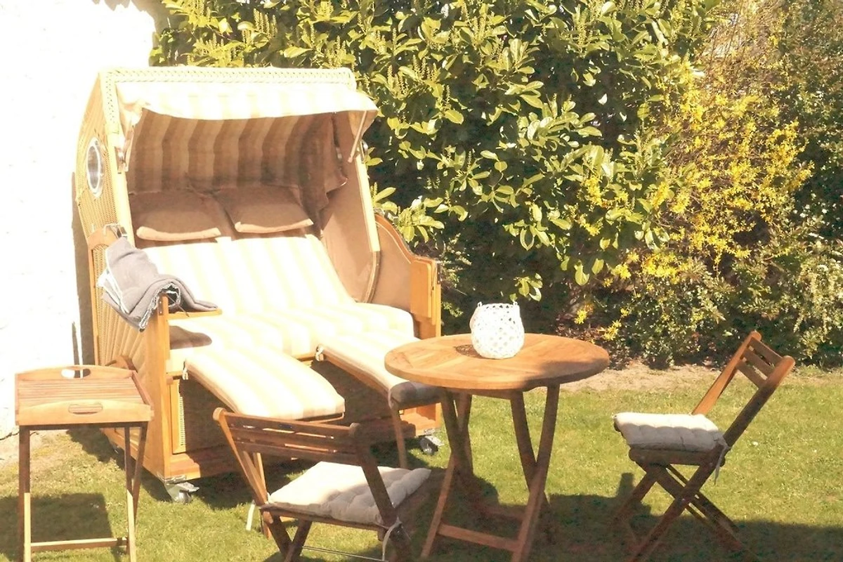 Auf dem Grundstück ist Platz zum Toben für die Kleinen und zum Entspannen für Sie. Die sanierte Villa verfügt einen direktem Zugang zum Garten mit Rasenfläche und Strandkorb.
