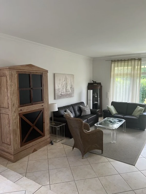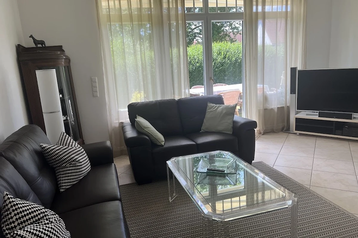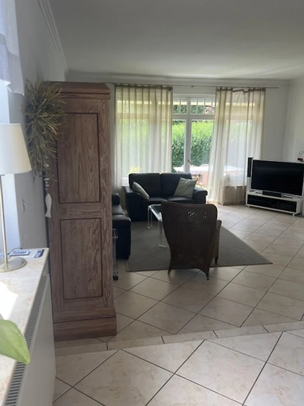 1 Großes Appartement im EG 120 qm, großzügiger Wohnraum mit Essbereich, Couch- und Curved-Flat-TV, Kamin, Terrasse und Garten, 3 Schlafzimmer, 2 Bädern, komplett eingerichtete Küche , Diele, KFZ Stellplatz. Waschmaschine vorhanden .