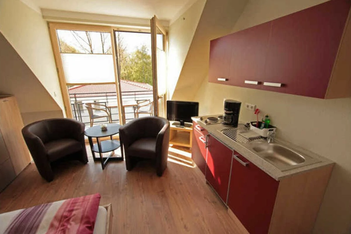 Geniessen Sie nach einer erholsamen Nacht , in einem unserer schönen Appartements, die Umgebung des malerischen Fischerdorfes Wieck. Lassen Sie sich beim Frühstück auf der Terrasse Ihres Appartements vom Ausblick auf den Greifswalder Bodden und die Silhouette der Greifswalder Altstadt verzaubern. In den frühen Morgenstunden können Sie die einkehrenden Fischerboote und die Möwen bei ihren Streifzügen beobachten. Entdecken Sie bei einem Spaziergang durch Wieck die reetgedeckten Fischerhäuschen und tauchen Sie bei einem Besuch des Hafenamtes in die Geschichte des maritimen Fischerdorfes ein. Lauschen Sie bei einem Besuch im Strandbad Eldena dem seichten Wasser und spüren Sie den feinen Sand unter Ihren Füssen. Die Kulisse der Klosterruine in Eldena lädt zu einem historischen Rundgang ein und beschert Ihnen einzigartige Erinnerungsfotos. Nach einem erlebnisreichen Tag können Sie den Abend bei kulinarischen Köstlichkeiten und fantastischen Sonnenuntergängen ausklingen lassen.