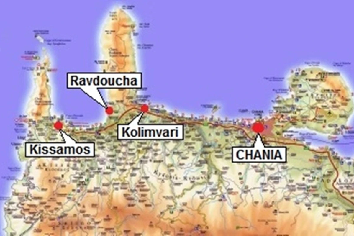 30 km westlich von der Stadt Chania und 45 km vom internationalen Flughafen CHQ (über die Schnellstraße). Dieses kleine Dorf mit nur 100 Einwohnern blickt auf den Golf von Kissamos-Kastelli.
