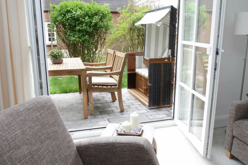 RUHIG, ZENTRAL GELEGEN und CHIC! Reihenhaus mit möblierter TERRASSE, mit Strandkorb!, nach Westen und kleinem GARTEN, KAMINOFEN und schöner Ausstattung. Für 2 Erwachsene und 1 Kleinkind, mit elegantem und gemütlichem Wohnbereich mit Einbauküche und Essplatz, 2 modernen Bädern (eins mit Wanne und Dusche, eins mit Dusche) und zusätzlichem Gäste-WC. Der Kaminofen sorgt in der Herbst- und Winterzeit für heimeliges Ambiente (für Brennholz muss - wenn Kaminofennutzung gewünscht ist - selbst gesorgt werden). Das Haus hat einen separaten Eingang und verfügt über einen Parkplatz vor dem Haus. Vom Haus aus können Sie das Ortszentrum (Friedrichstrasse) in ca. 5 Minuten und den Strand in ca. 10 Minuten zu Fuss erreichen (zum Strand sind es ca. 1,2 km). 56 qm Wohnfläche. WLAN Zugang ist kostenfrei vorhanden.