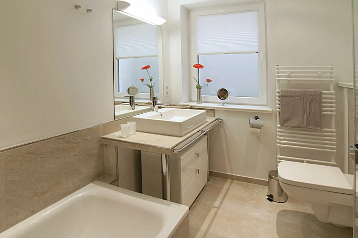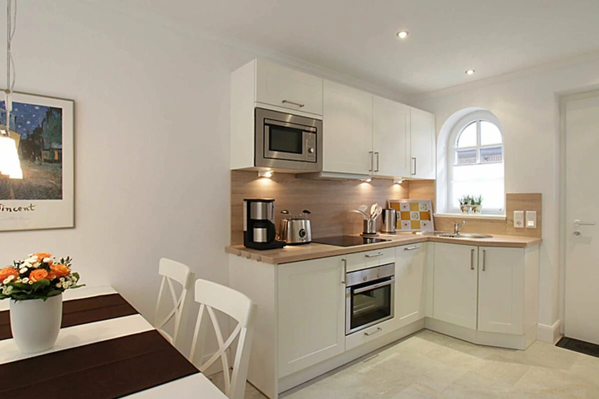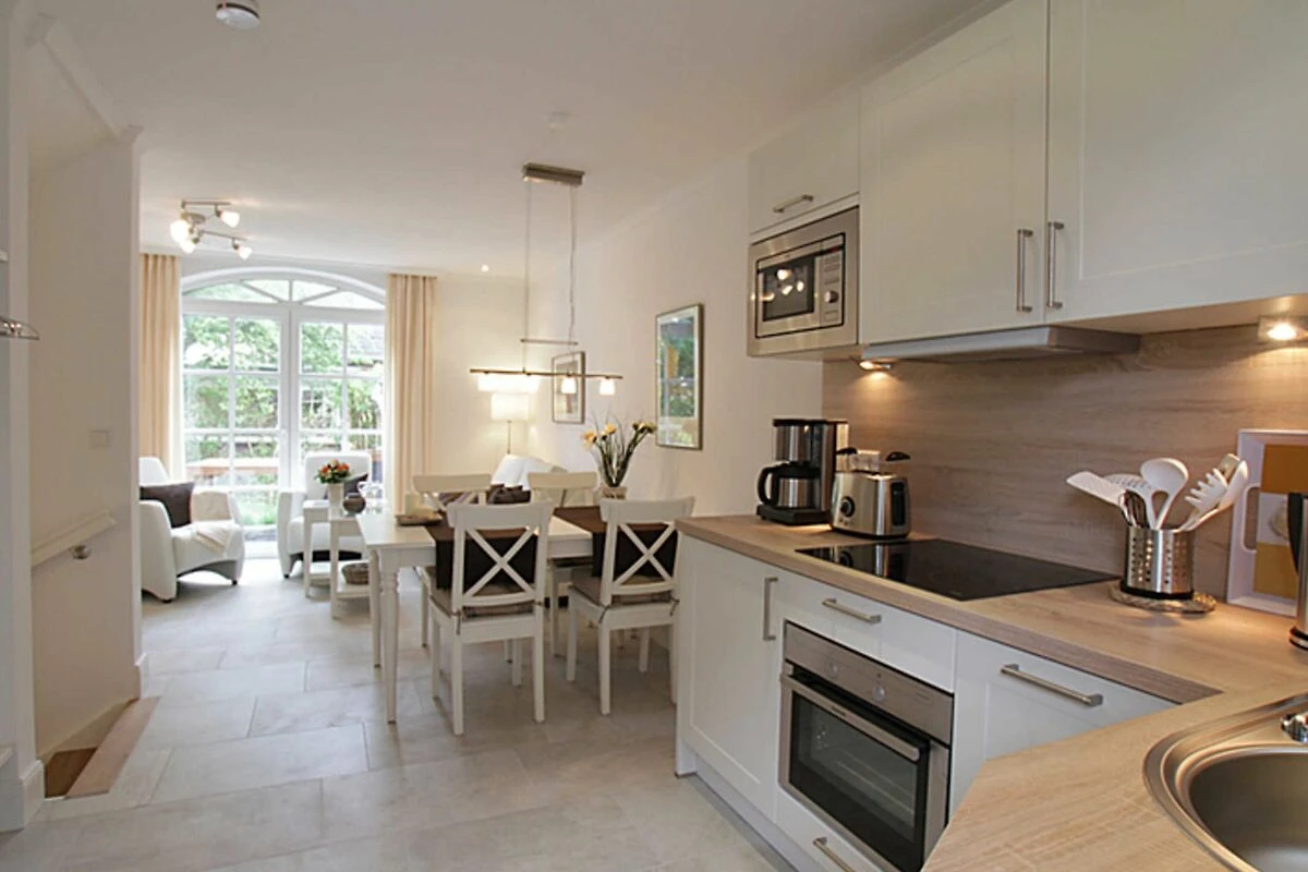 RUHIG, ZENTRAL GELEGEN und CHIC! Reihenmittelhaus mit möblierter TERRASSE nach Westen, KAMINOFEN und schöner Ausstattung. Für bis 4 Personen. Mit elegantem und gemütlichem Wohnbereich mit voller Einbauküche und Essplatz, 2 modernen Bädern (eins mit Wanne und Dusche, eins mit Dusche) und zusätzlichem Gäste-WC. Der Kaminofen sorgt in der Herbst- und Winterzeit für heimeliges Ambiente (für Brennholz muss - wenn Kaminofennutzung gewünscht ist - selbst gesorgt werden). Das Haus hat einen separaten Eingang und verfügt über einen Parkplatz vor dem Haus. Vom Haus aus können Sie das Ortszentrum (Friedrichstrasse) in ca. 10 Minuten und den Strand in ca. 15 Minuten zu Fuss erreichen (zum Strand sind es ca. 1,2 km). 56 qm Wohnfläche.
