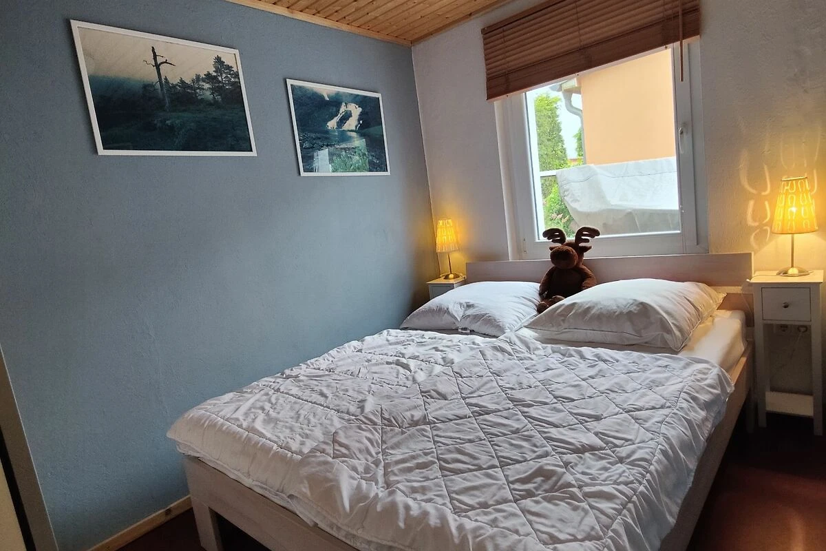 • 2 Schlafräume ( ein Bett mit einer Breite von 1,40 m für welches man ein grosses Laken benötigt und ein Bett mit einer Breite von 1,60 m. Diese ist mit zwei Matratzen in 0,80 m Breite bestückt, so dass man dafür zwei normale Laken braucht),