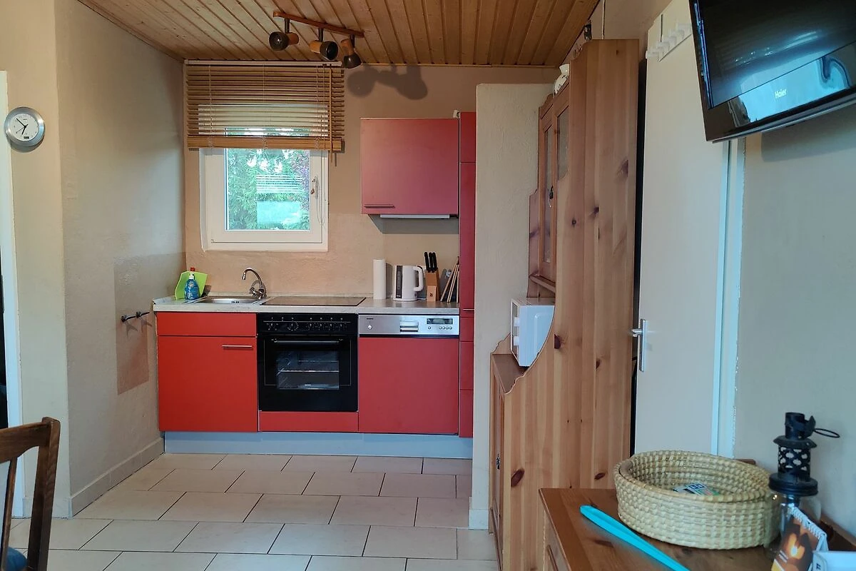 • 1 Wohnraum mit offener Küche (Backofen, Geschirrspüler),