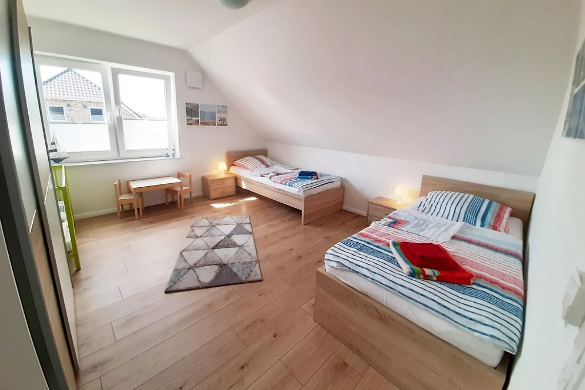 Unser Ferienhaus Friesentraum im Nordseebad Carolinensiel liegt zentral im Ortskern. Es ist nur ein Steinwurf zum Supermarkt, zu den Gaststätten, zum Bäcker usw. Den Strand erreicht man über einen schönen Fußweg entlang der Harle ( kleiner Fluss ). Das neue Ferienhaus ist großzügig und geschmackvoll eingerichtet und bietet Ihnen ca. 118 Quadratmeter Wohnfläche. Der Friesentraum ist für max. 6 Personen + Baby ausgelegt und verfügt über drei Schlafzimmer. Zwei mit Doppelbett und eins mit zwei Einzelbetten + ein Babybett, eine große Küche, ein helles Wohn/Esszimmer mit Terrassenzugang und zwei Badezimmer. Eine AEG Waschmaschine steht Ihnen im Hauswirtschaftsraum zur Verfügung. Das ganze Ferienhaus (außer das Bad im DG) ist mit elektrischen Rollläden ausgestattet. Für ein gutes Raumklima sorgt die Fußbodenheizung und eine elektrisch gesteuerte Lüftungsanlage.