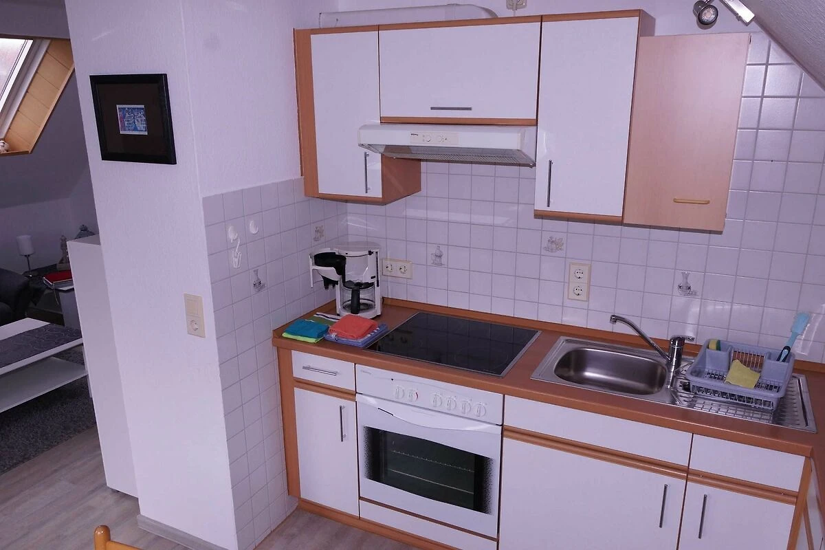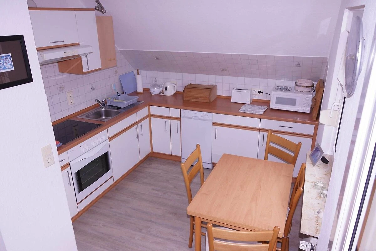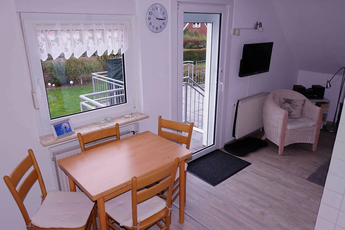 Die Küche ist geräumig und hat alles, was zum Kochen benötigt wird. Vom Esstisch mit 4 Stühlen + Hochstuhl blicken Sie in den Garten.