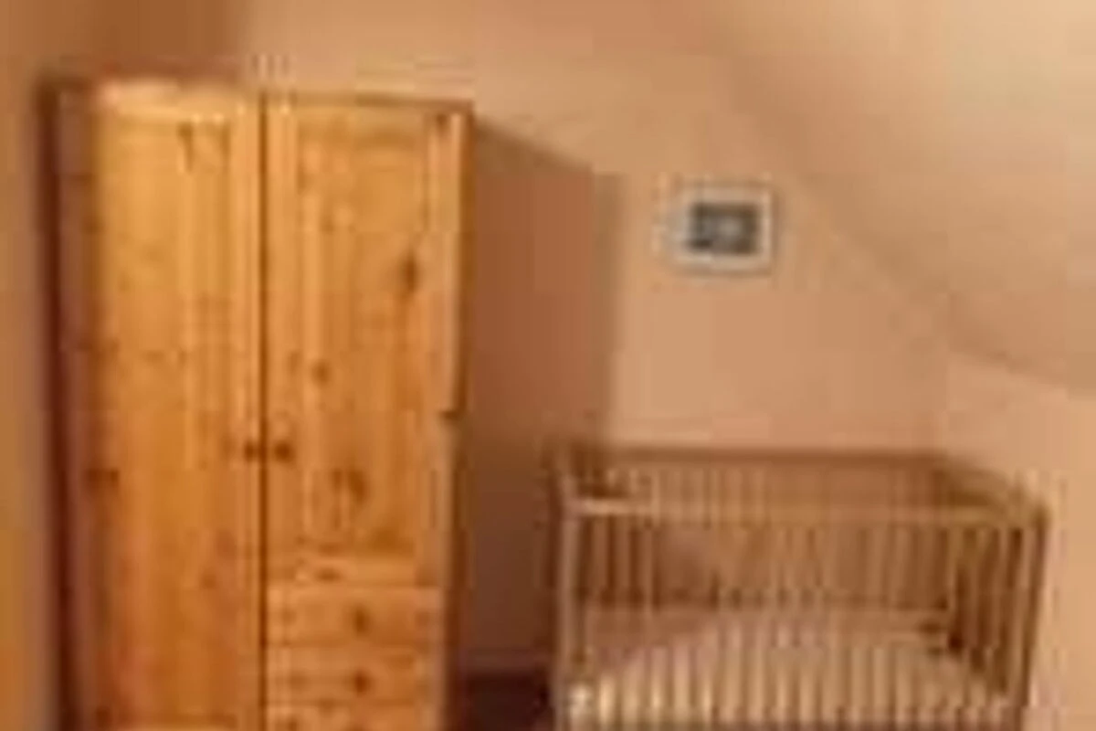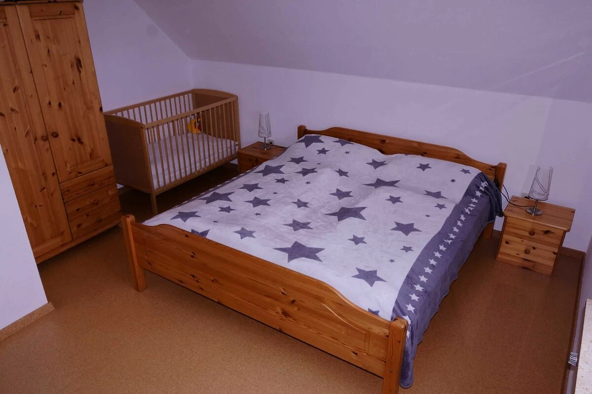 In beiden Schlafzimmern befinden sich fusswarme Korkböden. Im Elternschlafzimmer steht ein Babybett.