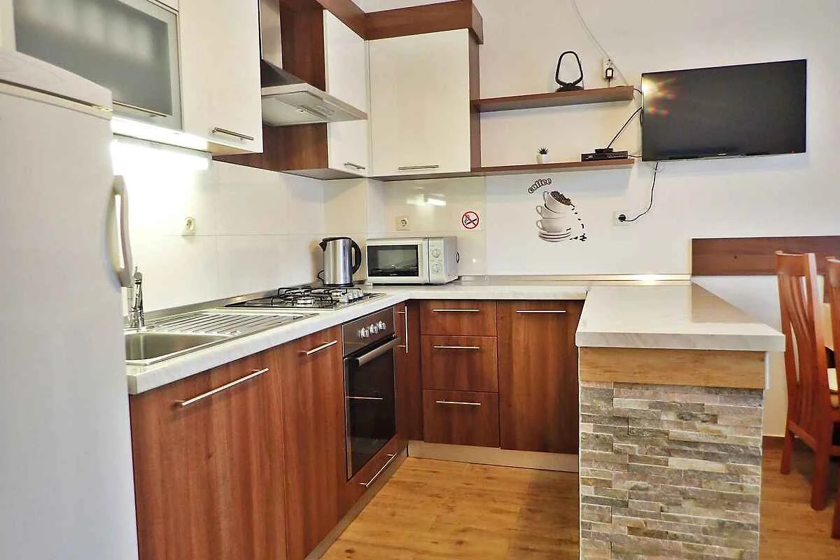 . Wohnküche (15 qm) mit Sitzecke und TV. 2 Schlafzimmer jeweils (12 qm) mit 1 Doppelbett und Zugang zum Balkon (Gartenmöbel). Kochecke in der Wohnküche (10 qm) mit Essecke, Gasherd (3 Flammen), Elektroherd (1 Platte), Backofen, Dunstabzugshaube, Kühlschrank (Eisfach), Mikrowelle und elektrischem Wasserkocher. 2 Bäder jeweils (5 qm) mit Dusche, 1 Waschbecken und WC.