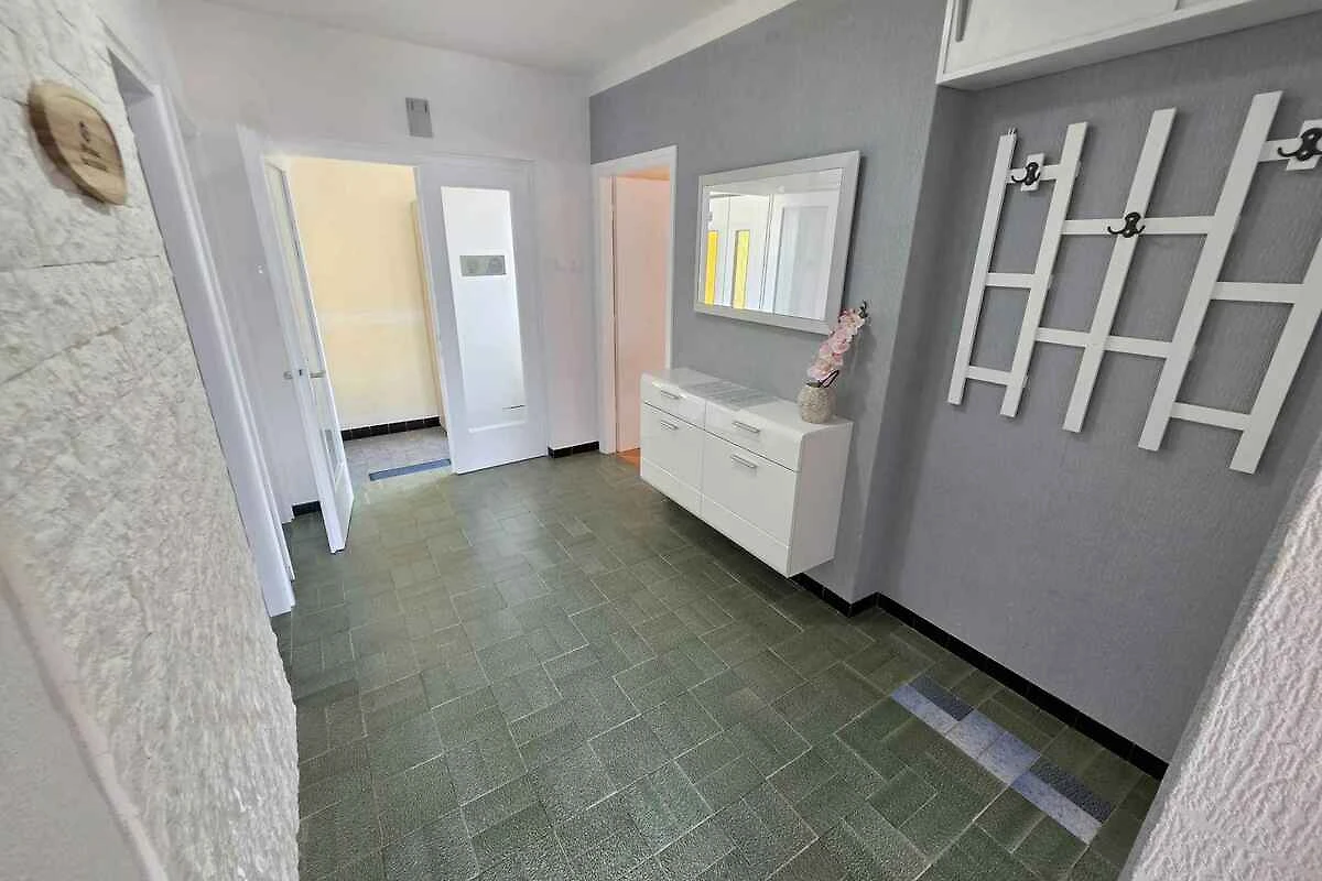 Der Eingang in Ihre Ferienwohnung führt über eine Aussentreppe und die 24 qm grosse Terrasse direkt in den Vorraum. Kochecke (20 qm) mit Elektroherd (4 Platten), Backofen, Kühlschrank, Kaffeemaschine, Toaster, elektrischem Wasserkocher und Zugang zum Balkon. Flur (4 qm). Bad (6 qm) mit Dusche, 1 Waschbecken und WC. Esszimmer. Schlafzimmer (16 qm) mit 1 Doppelbett, TV und Zugang zum Balkon. Schlafzimmer (16 qm) mit 1 Doppelbett und Zugang zum Balkon.
