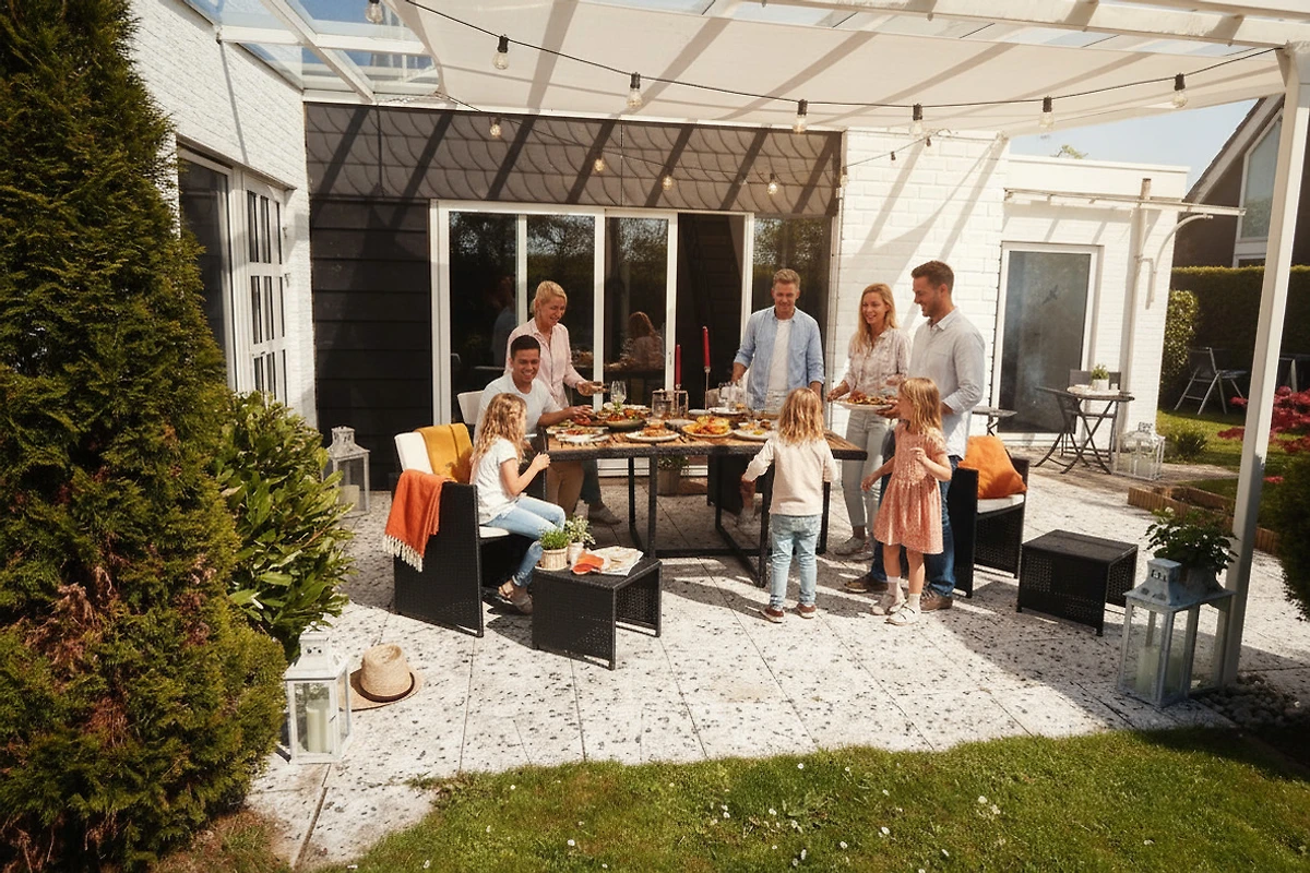 Auf der sonnigen Terrasse laden eine stilvolle Rattan-Sitzgruppe mit vier Sesseln und Tisch, zwei komfortable Liegen sowie ein Grill zu entspannten Stunden im Freien ein. Hier genießen Sie Frühstück im Grünen oder laue Sommerabende in gemütlicher Atmosphäre.