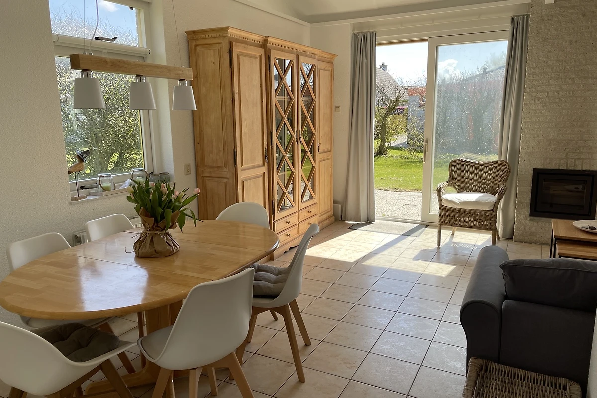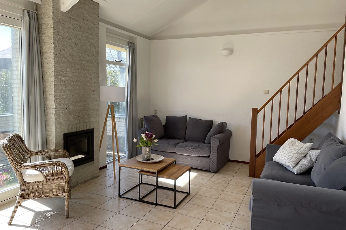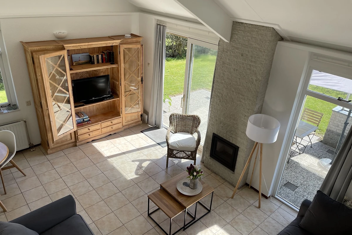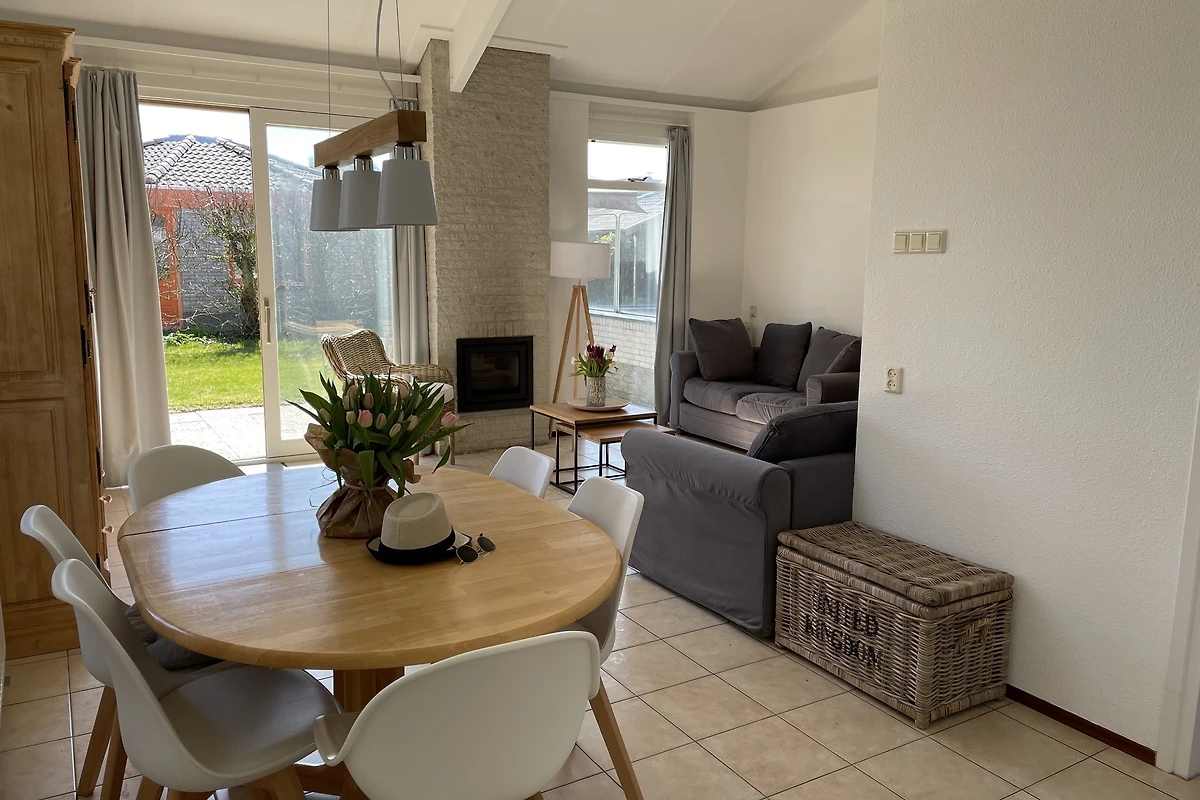 Der Bungalow ist modern und komfortabel eingerichtet. Im Erdgeschoss finden Sie ein stimmungsvolles Wohnzimmer mit offenem Kamin, zwei bequemen Sofas und einem großen Flachbildfernseher. Im Essbereich steht ein großzügiger Esstisch. Durch die große Schiebetür haben Sie direkten Zugang zur sonnigen Terrasse und zum vollständig eingezäunten Garten, ideal für Familien mit Kindern und Haustieren.