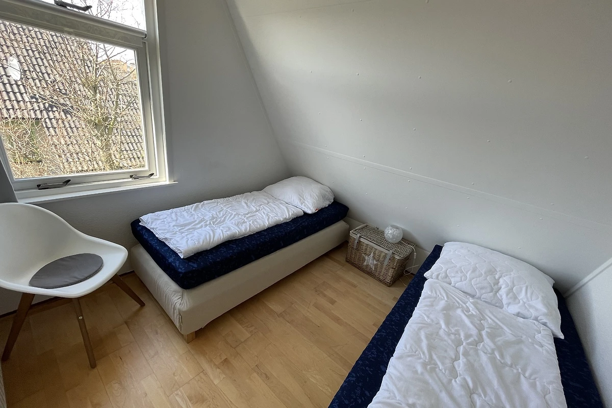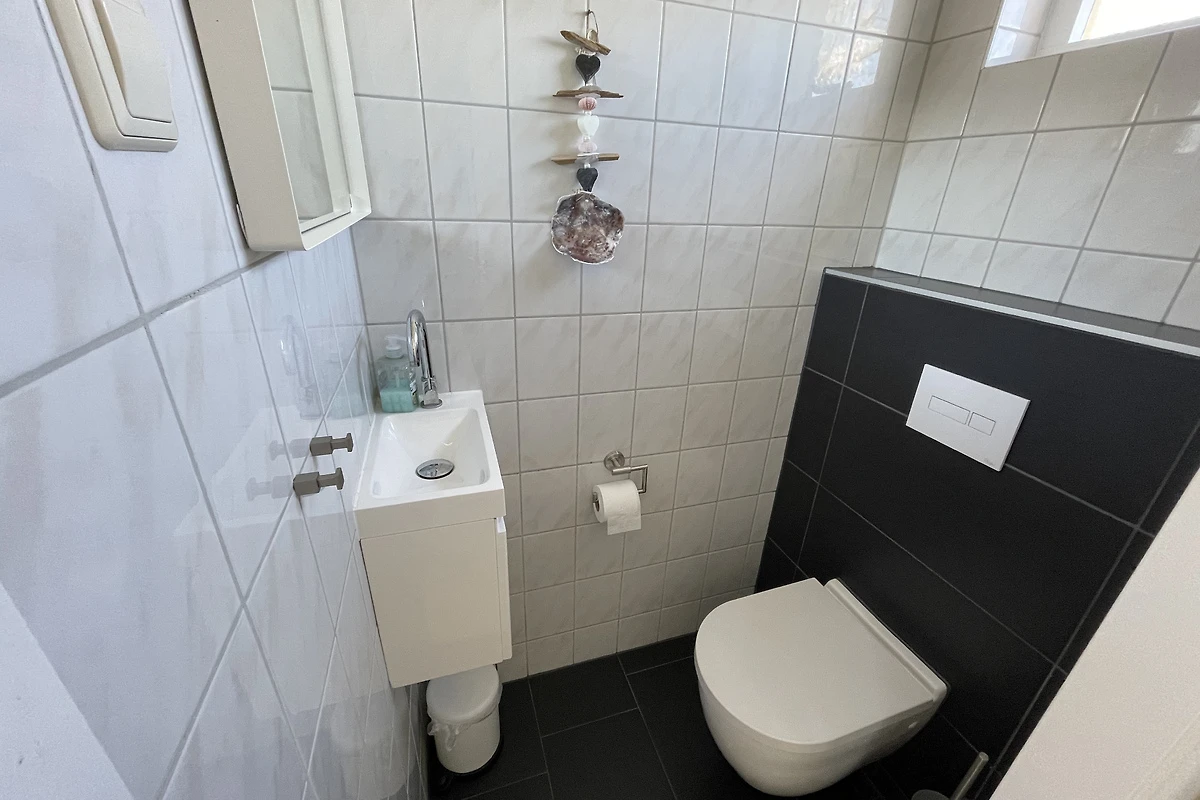 Außerdem befinden sich im Erdgeschoss das Badezimmer mit Dusche und Waschbecken sowie eine separate Toilette. Im ersten Stock gibt es zwei Schlafzimmer, davon eines mit einem Doppelbett und eines mit zwei Einzelbetten, die auch zusammengeschoben werden können.