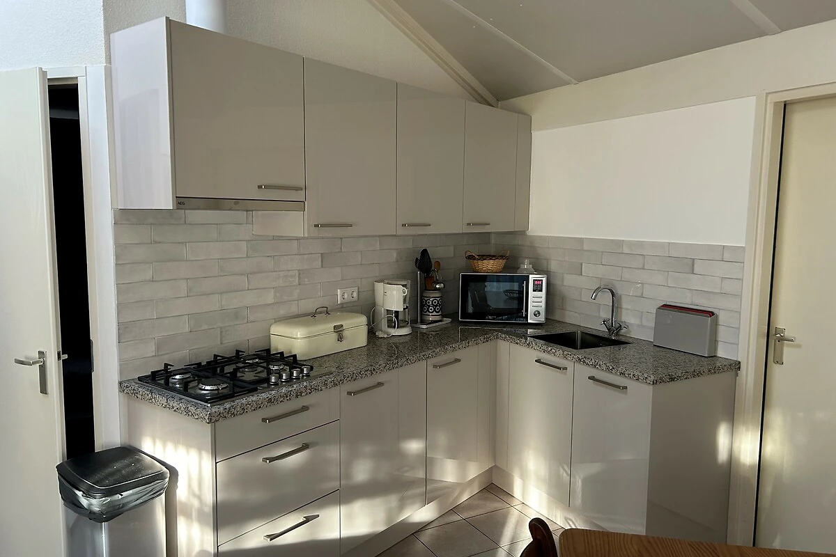 Der Bungalow ist ebenerdig und perfekt für einen entspannten Aufenthalt eingerichtet. Die offene Küche und das Wohnzimmer mit Schiebetür zum Garten sorgen für eine helle, großzügige Atmosphäre. An kühleren Tagen können Sie den Kamin anzünden für extra Gemütlichkeit. Die Küche ist komplett ausgestattet mit einer Kombi-Mikrowelle/Backofen, Kühlschrank, Gaskochfeld, Wasserkocher und Toaster.