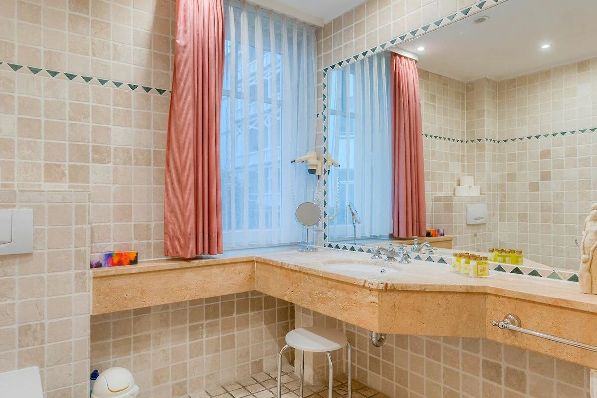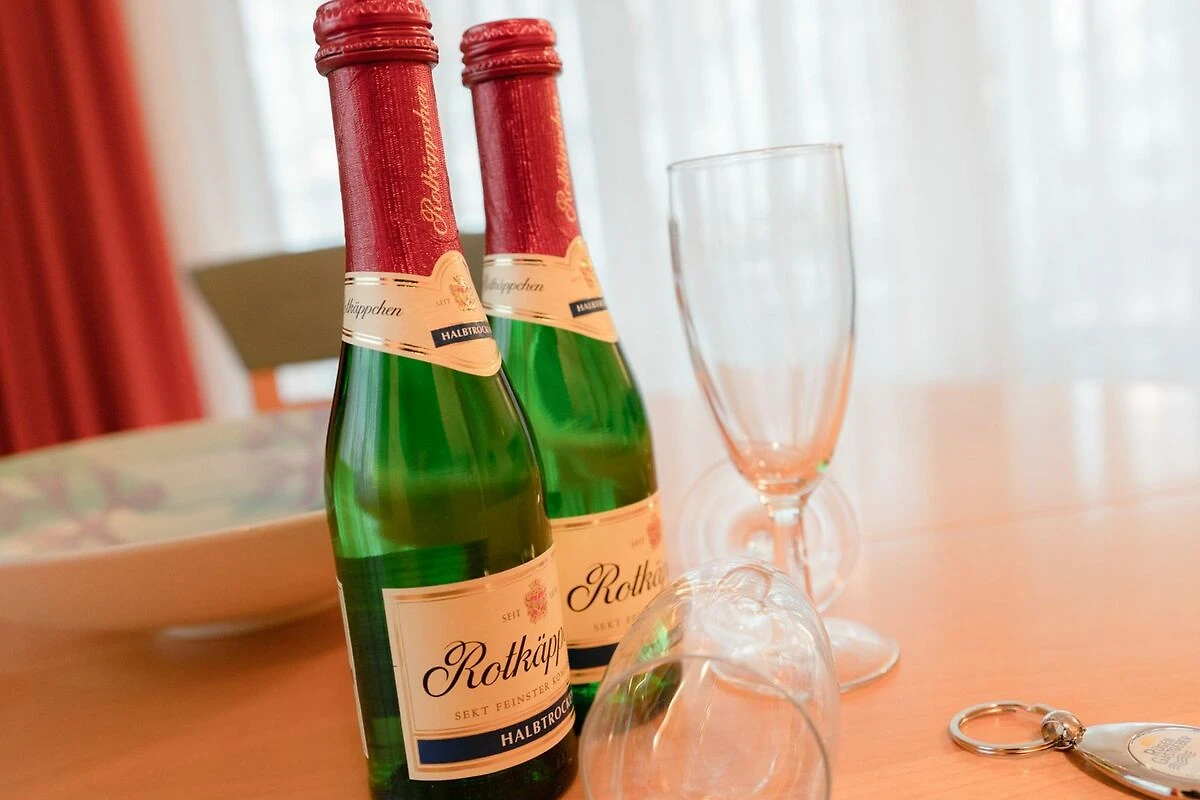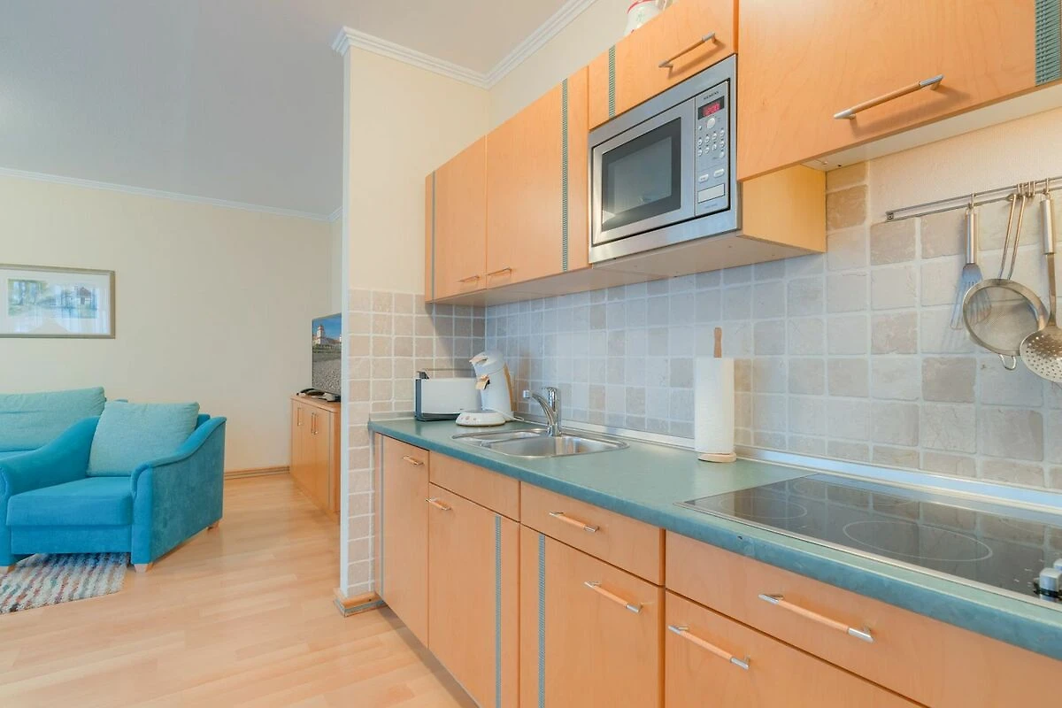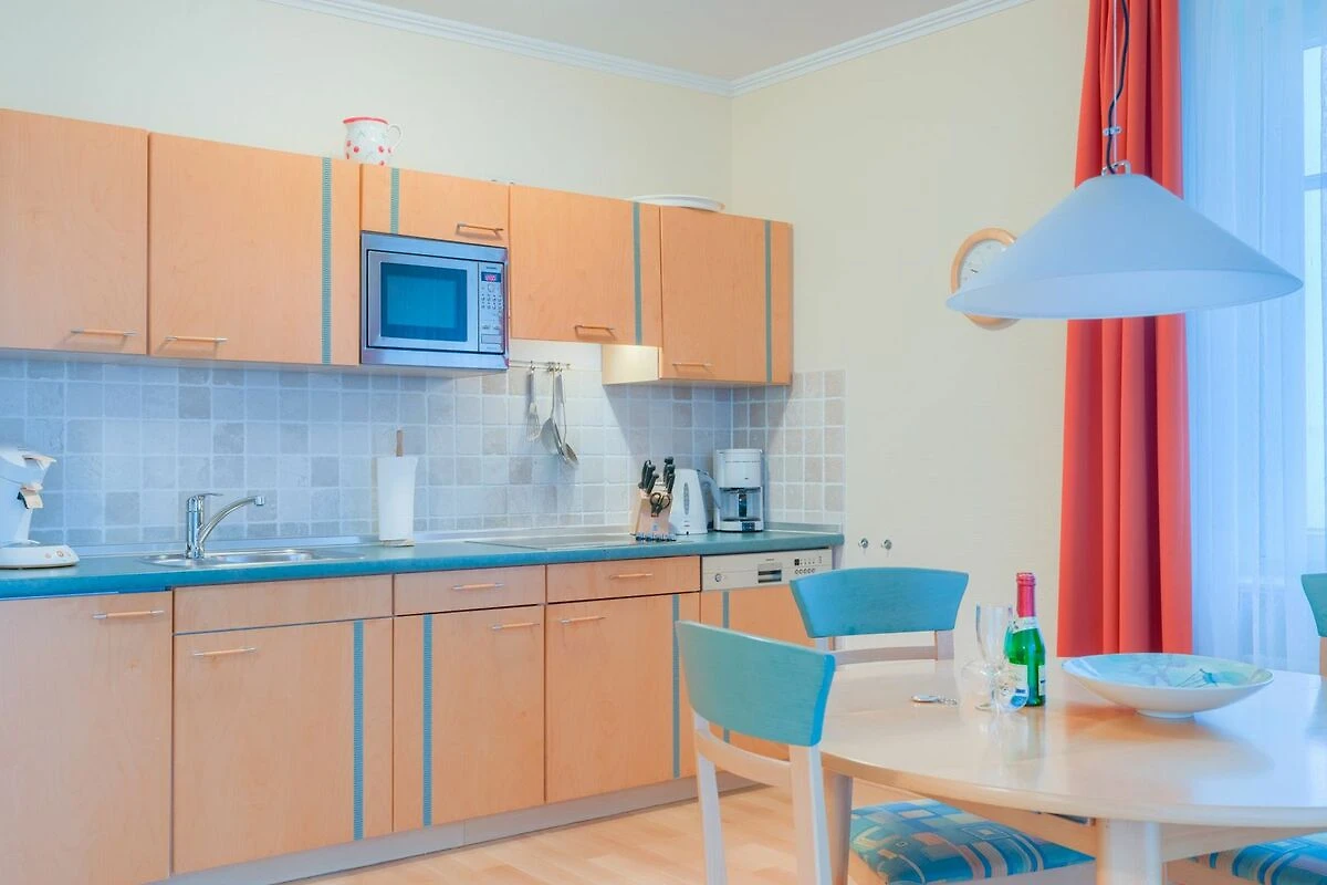 Die hier angrenzende Küchenzeile ist mit einem Kühlschrank mit Gefrierfach, einem Geschirrspüler, einem Cerankochfeld, einer Mikrowelle und einem Backofen ausgestattet. Eine Kaffeemaschine, ein Toaster, ein Eierkocher und ein Wasserkocher stehen Ihnen hier selbstverständlich zur Verfügung.