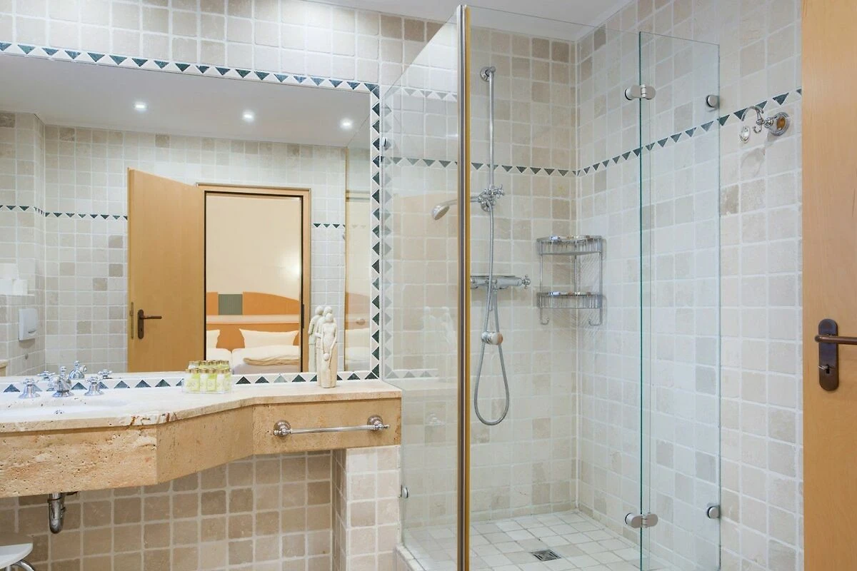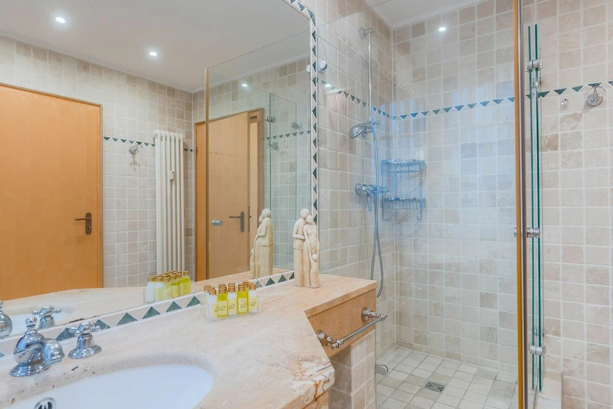 Das Badezimmer ist mit einer Dusche und WC ausgestattet.