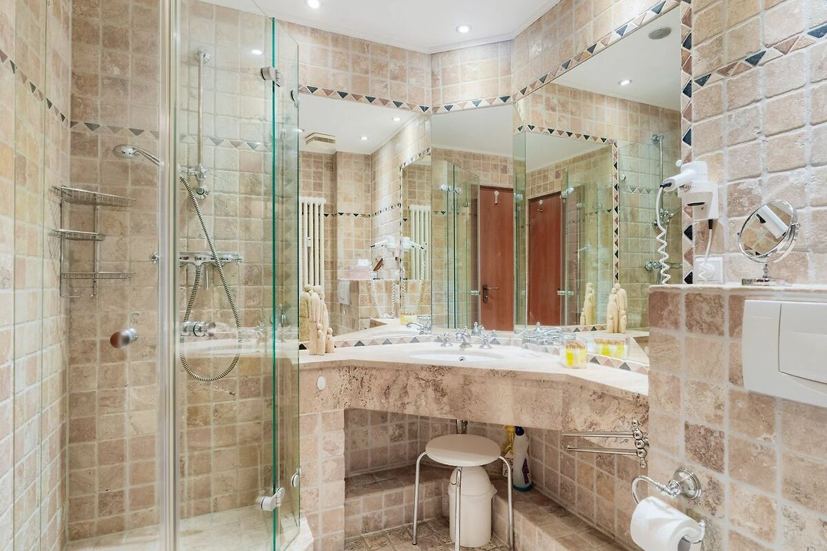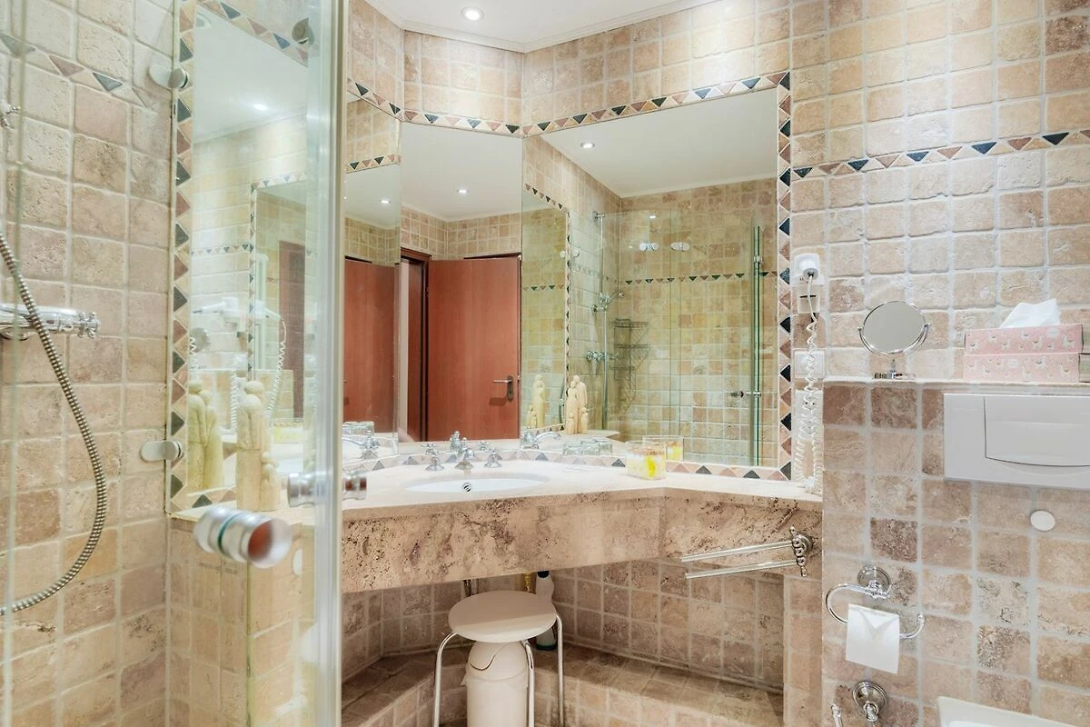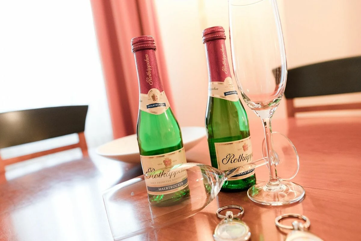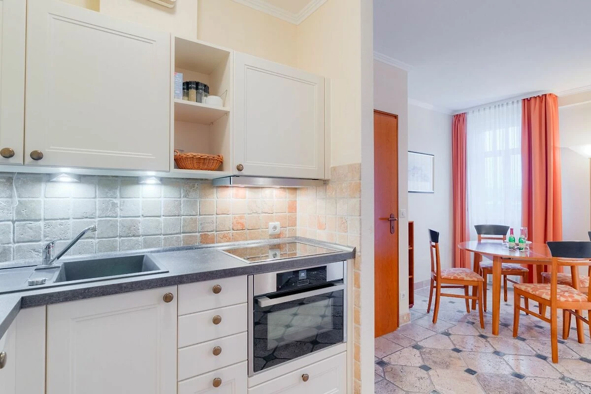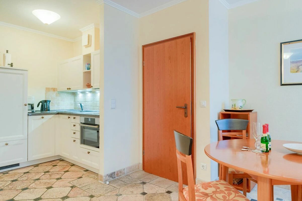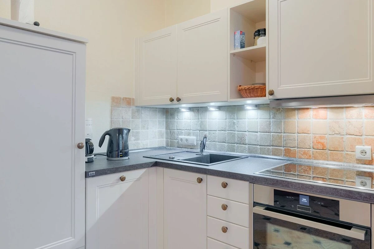 Die hier angrenzende Küchenzeile ist mit einem Kühlschrank mit Gefrierfach, einem Geschirrspüler, einem Backofen mit Cerankochfeld und einer Mikrowelle ausgestattet. Eine Kaffeemaschine, ein Toaster, ein Eierkocher und ein Wasserkocher stehen Ihnen hier selbstverständlich zur Verfügung.