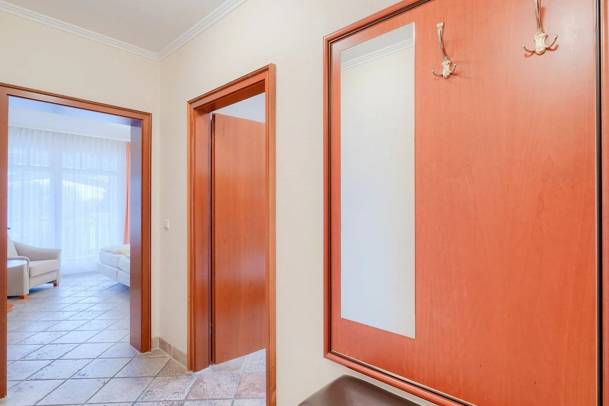 Im Schlafzimmer bietet Ihnen ein Doppelbett ausreichend Platz für einen erholsamen Schlaf. Ihre Urlaubskleidung können Sie im geräumigen Schrankraum unterbringen.