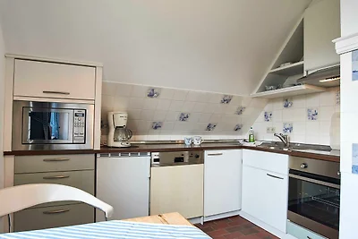 Die Küche mit kleinem Essbereich ist ausgestattet mit einem Ceranfkochfeld, Backofen, Mikrowelle, Geschirrspüler Kaffeemaschine, Wasserkocher usw.