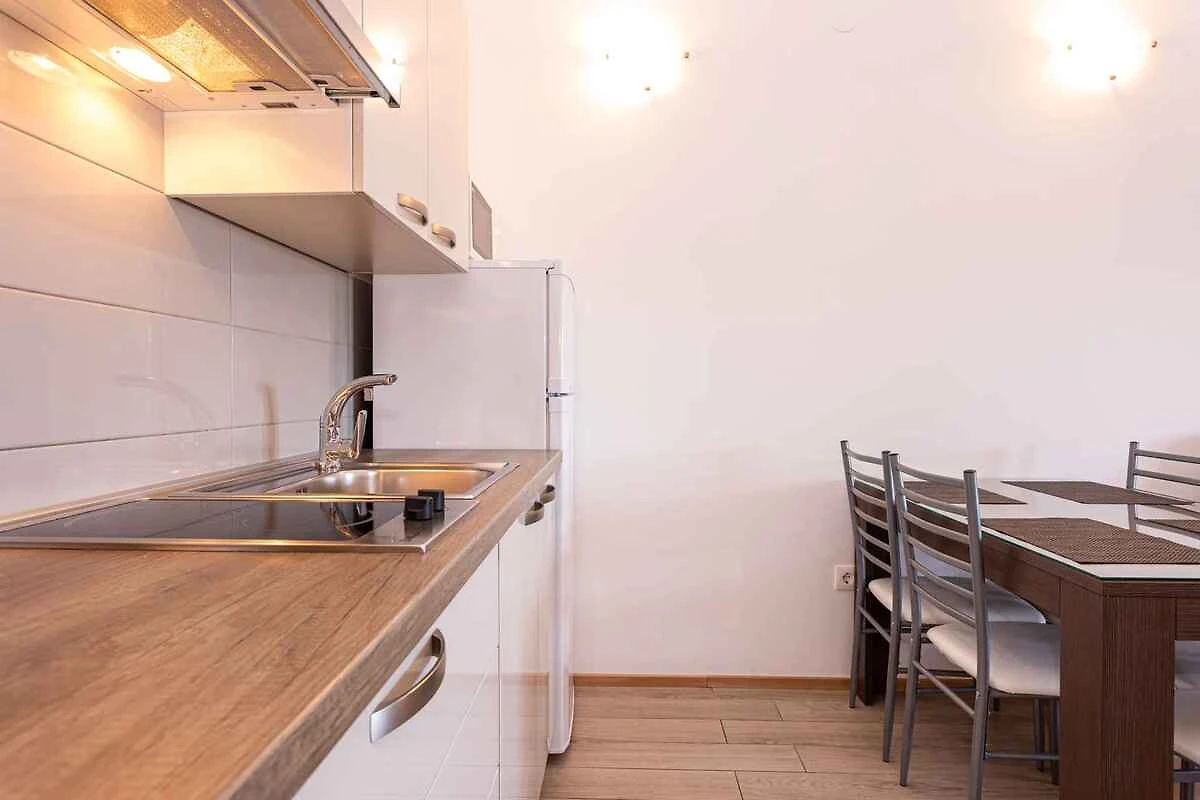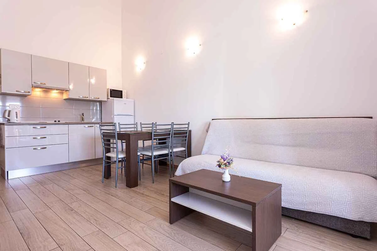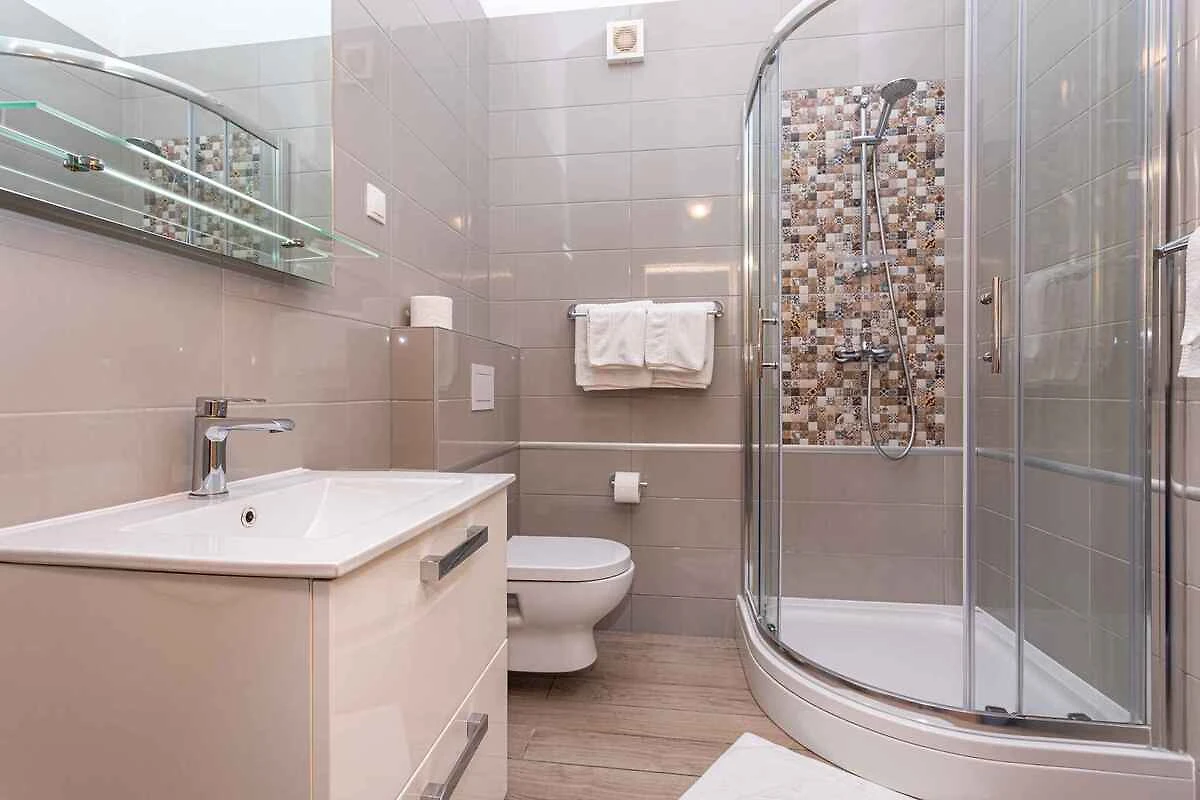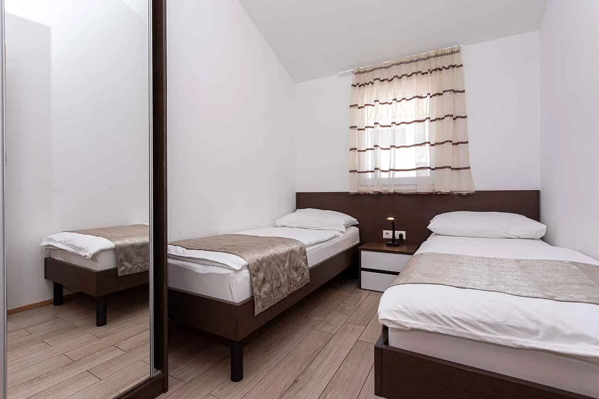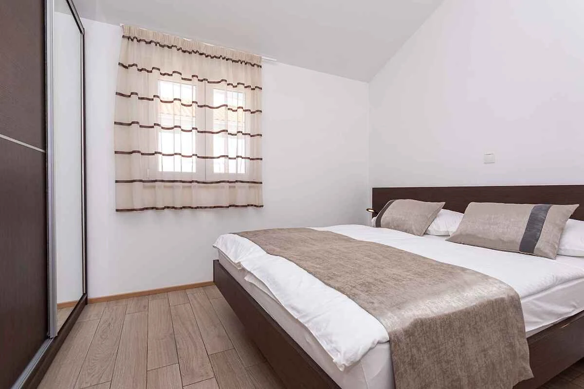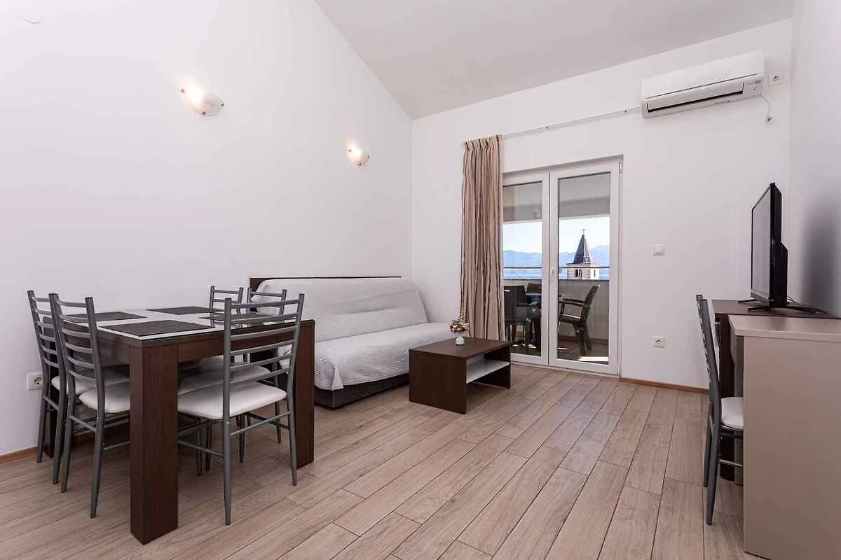 Die Ferienwohnung befindet sich in einem 2016 erbauten Apartementhaus und ist modern und luxuriös eingerichtet. Das Grundstück liegt in einem Wohngebiet, im Ortszentrum. Auch wegen des Ausblicks vom Grundstück auf das Meer und der ruhigen und sonnigen Hanglage ist das Domizil beliebt. Zur gemeinsamen Nutzung stehen zur Verfügung: Grillmöglichkeit, Gartenmöbel und Hof. Die Unterkunft verfügt über eine eigene Rezeption, die täglich arbeitet. Babybett auf Anfrage erhältlich.