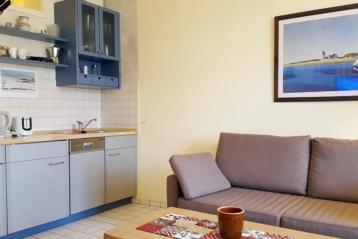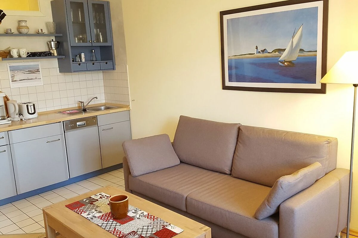 Der Wohnbereich ist eingerichtet mit einer Doppelschlafcouch mit Farb-TV, einer Pantryküche mit Geschirrspüler und einem Esstisch.