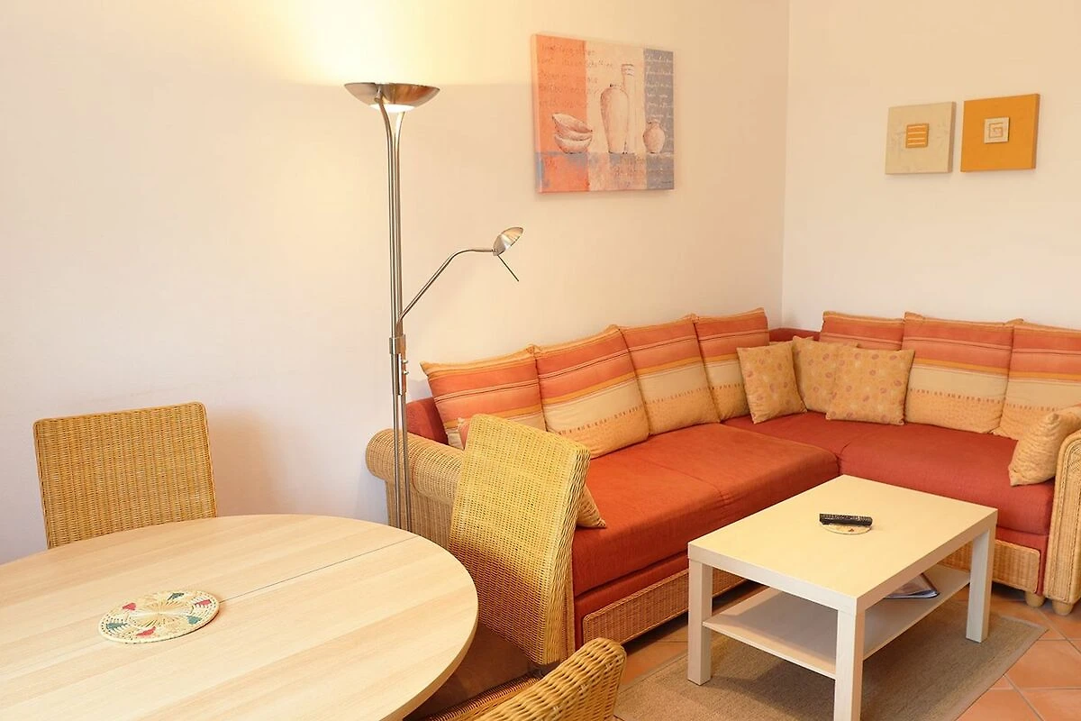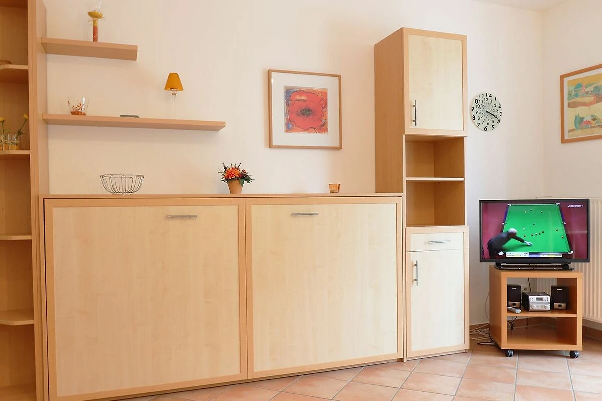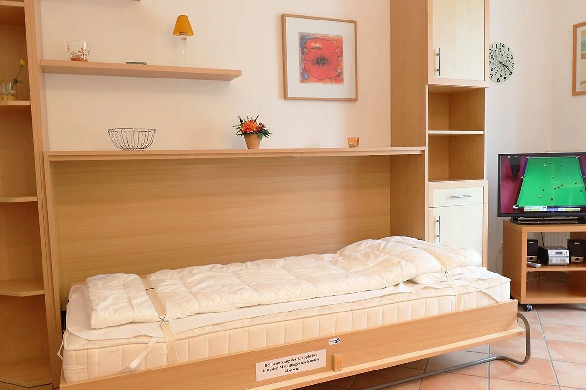Im grossen Schlafzimmer finden Sie ein Doppelbett. Hell und freundlich eingerichtet verfügt der Wohnbereich über eine Sitzgruppe und Esstisch sowie eine ausziehbare Couch und ein Schrankbett.