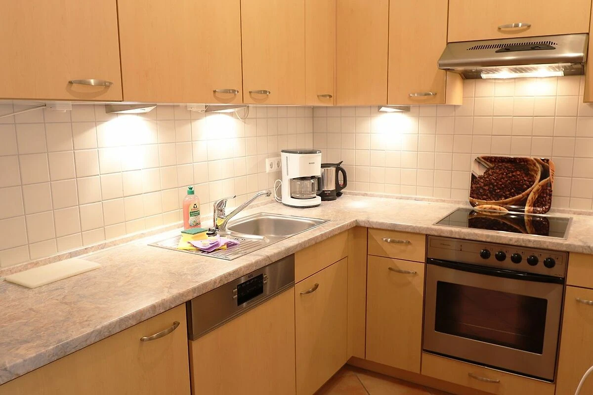 Die moderne Küche mit Geschirrspüler und Mikrowelle verfügt über allen Komfort . Zur technischen Ausstattung gehören Farb-TV und kleine Hifi-Anlage.