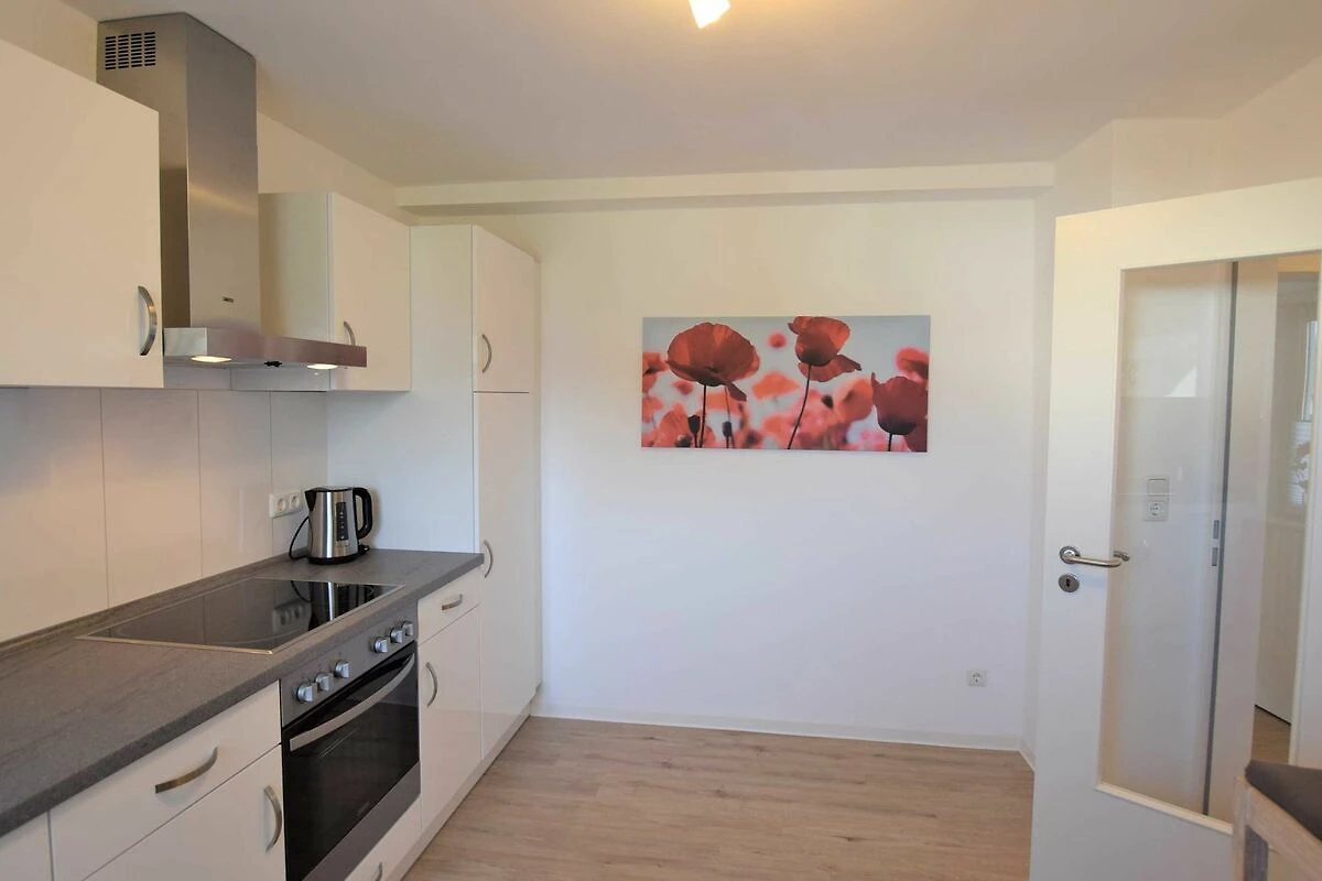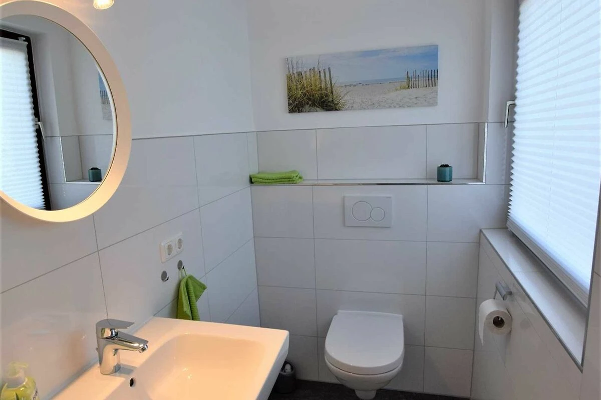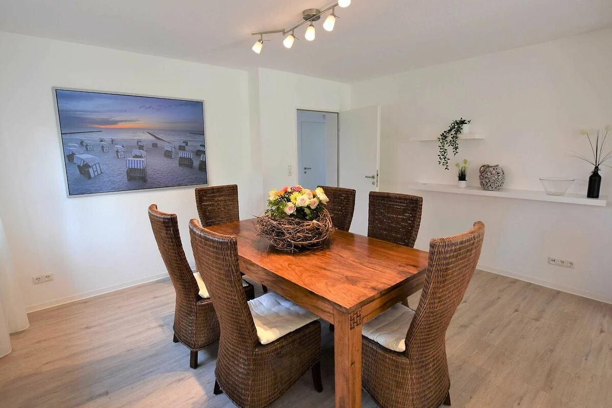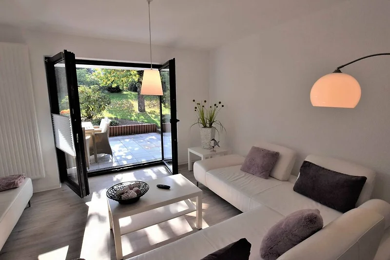 Die Wohnung für maximal 6 Personen (5. und 6. Person ist nur auf Anfrage mietbar) (90m ²) besteht aus einem Wohnzimmer mit Essbereich, einem Schlafzimmer mit Doppelbett, einem Schlafzimmer mit 2 jeweils ausziehbaren Einzelbetten, einer komplett ausgestatteten Küche, einem modernen Duschbad, einem separaten WC und einer sonnigen Terrasse inklusive Garten.