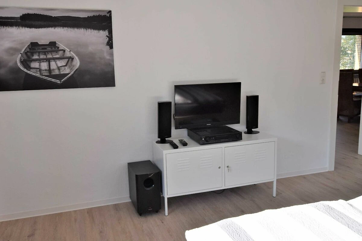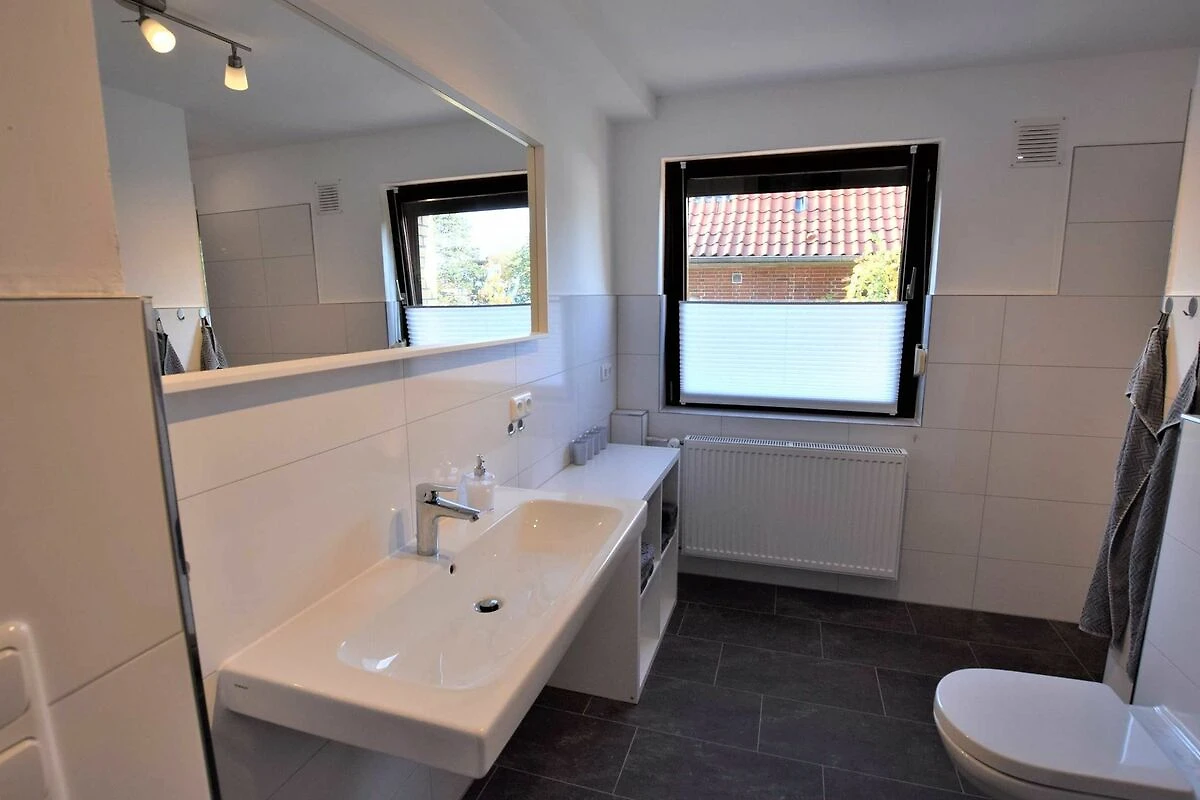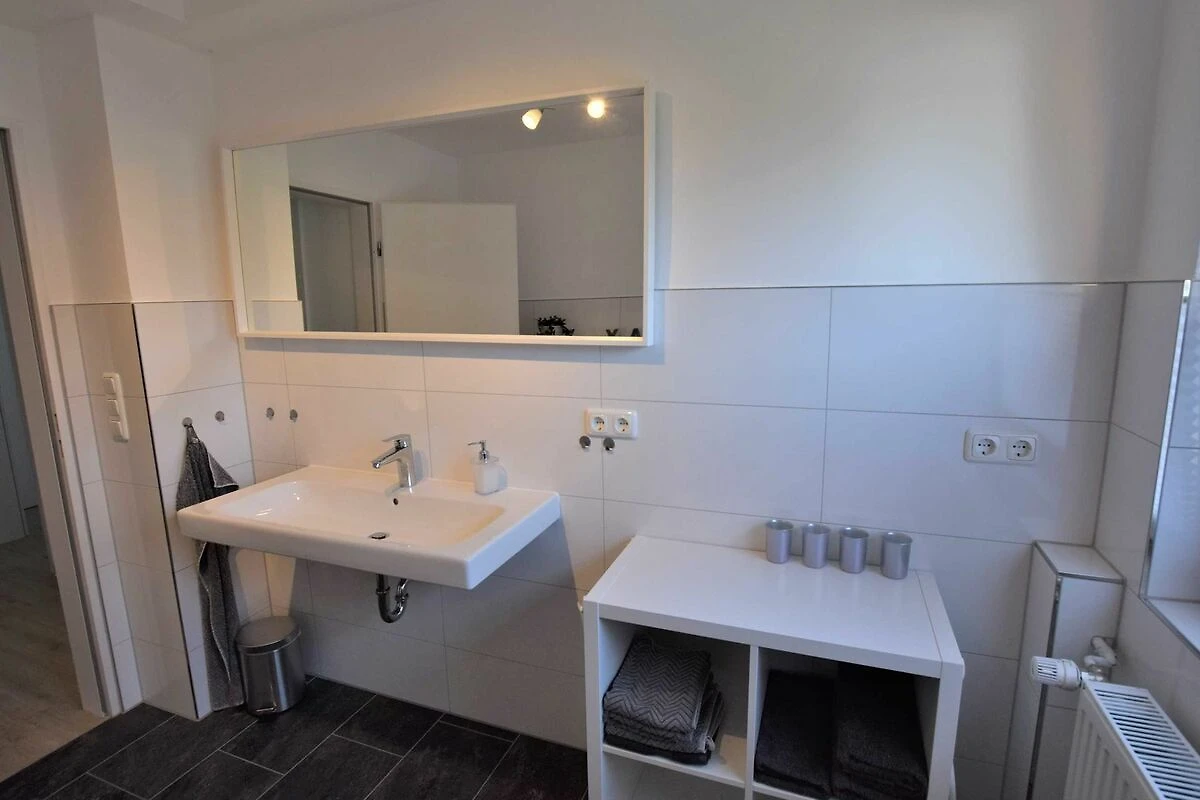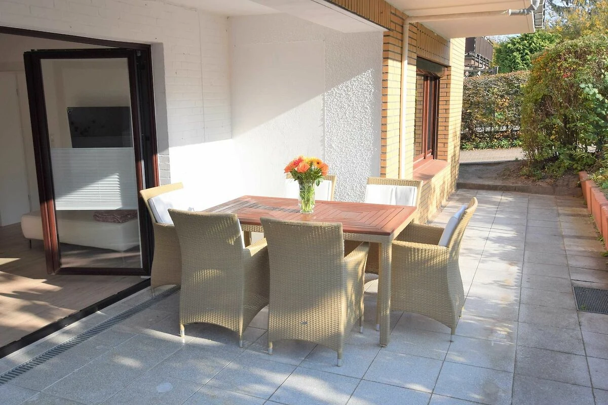 Die Wohnung für maximal 6 Personen (5. und 6. Person ist nur auf Anfrage mietbar) (90m ²) besteht aus einem Wohnzimmer mit Essbereich, einem Schlafzimmer mit Doppelbett, einem Schlafzimmer mit 2 jeweils ausziehbaren Einzelbetten, einer komplett ausgestatteten Küche, einem modernen Duschbad, einem separaten WC und einer sonnigen Terrasse inklusive Garten.
