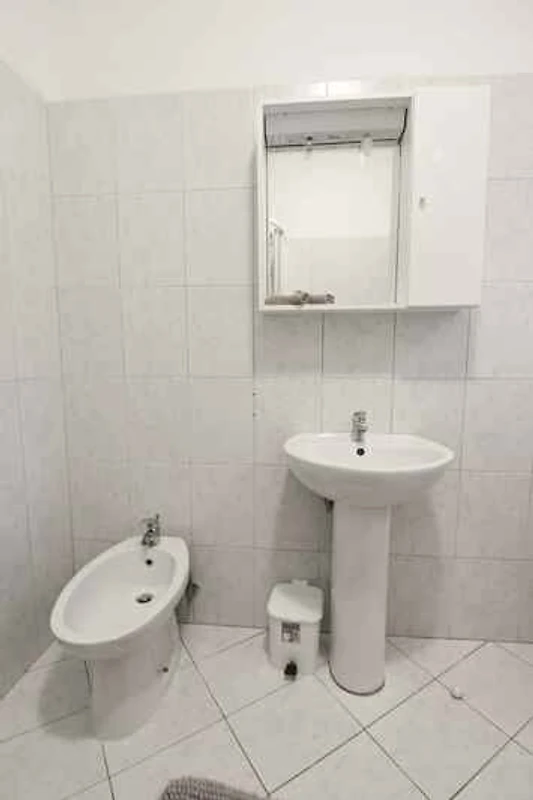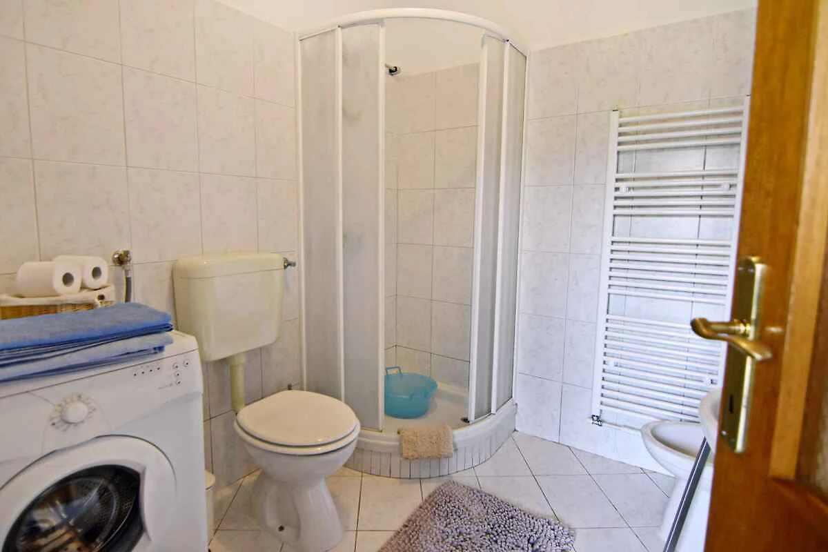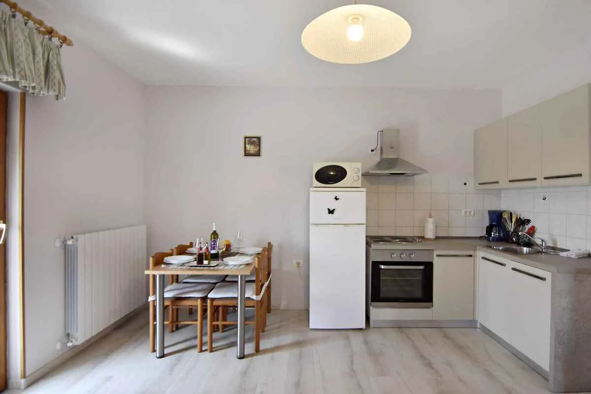 Der Eingang in Ihre Ferienwohnung befindet sich in Hochparterre und führt über 7 Stufen direkt in den Vorraum mit Garderobe. Automatische Aussenbeleuchtung, Griff. Aufenthaltsraum mit 1 Zusatzbett auf Doppelausziehcouch, TV, Essecke (4 Plätze) und Zugang zum Balkon (Gartenmöbel, 1 Tisch, 2 Stühle, gemeinsam mit Wohnküche). Schlafzimmer mit 1 Doppelbett, 1 Zusatzbett auf Couch/Sofa (nur für Kinder unter 10 Jahre geeignet) und Sitzecke. Küche im Wohnzimmer mit TV, Essecke (4 Plätze), Elektroherd, Dunstabzugshaube, Kühlschrank (30 l, Eisfach), Mikrowelle, Kaffeemaschine, Toaster, elektrischem Wasserkocher und Zugang zum Balkon. Bad mit Waschmaschine, Dusche, 1 Waschbecken, WC, Bidet und Föhn.