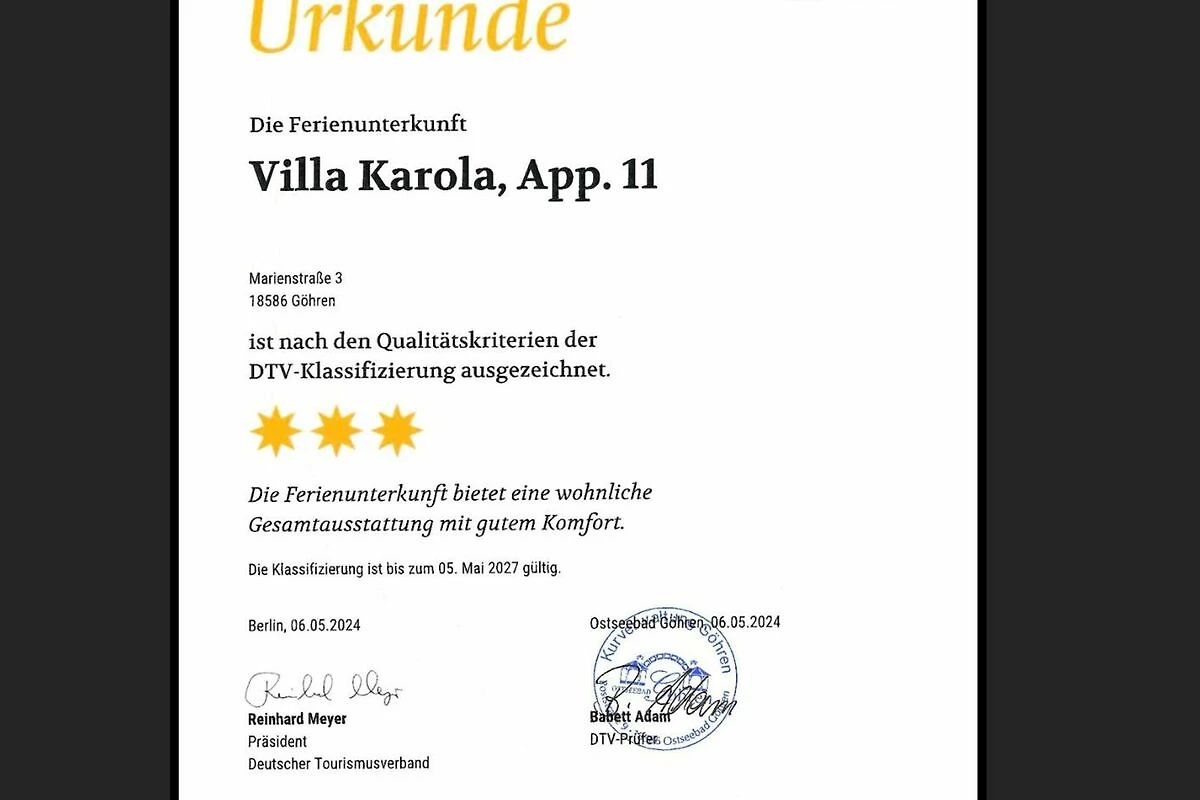 «Villa Karola Wohnung 11» erreicht eine Urlauberbewertung von 5 (Bewertungsskala: 1 bis 5) bei 1 abgegebenen Bewertung.