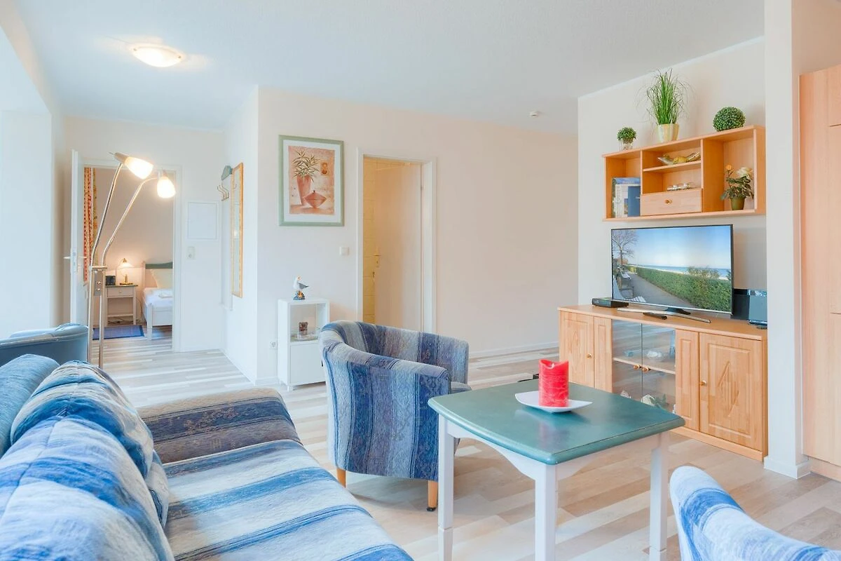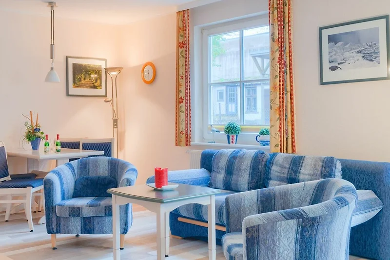 Im grosszügigen Wohnbereich laden bequeme Polstergarnituren und ein Flachbildfernseher zu geselligen Abenden ein. Durch die ausklappbare Couch ist eine Belegung der Ferienwohnung mit 4 Personen möglich. Der Essbereich ist im Wohnbereich integriert und ein Tisch mit 4 Stühlen bietet hier ausreichend Platz zum gemeinsamen Essen.