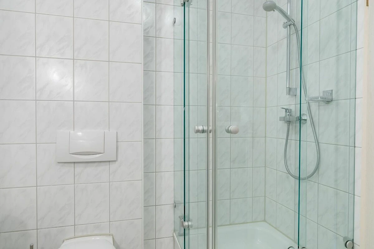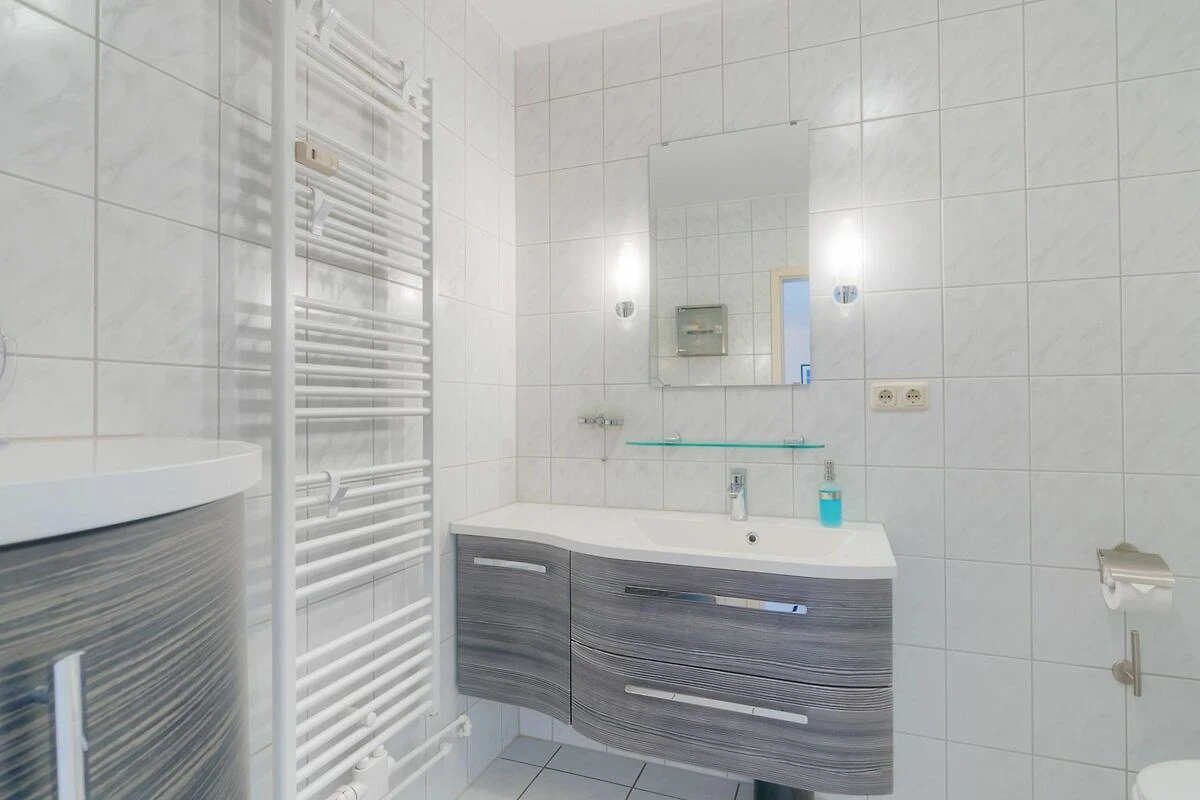 Das Badezimmer ist mit einer Dusche, WC und einem Handtuchheizkörper ausgestattet. In den Schränken haben Sie genügend Stauraum für Ihre Wasch- und Kosmetikutensilien.